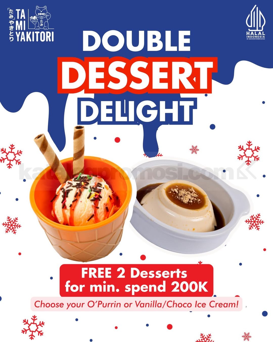 Promo Tami Yakitori Double Dessert Delight gratis 2 dessert dengan minimal transaksi Rp200.000, khusus dine in selama liburan Natal.