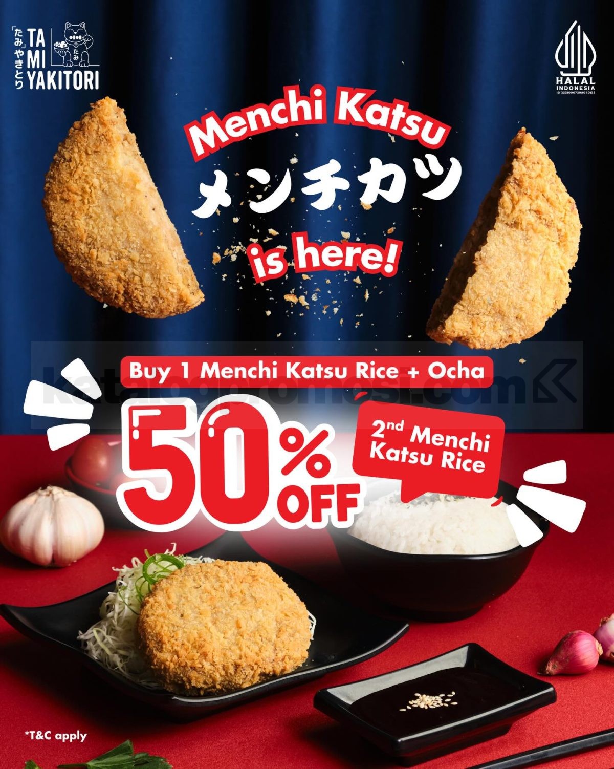 Promo Tami Yakitori NEW! Menchi Katsu Rice Diskon 50% untuk menu kedua dengan pembelian Menchi Katsu Rice + Ocha, berlaku hingga tanggal 30 Januari 2026 untuk dine in.