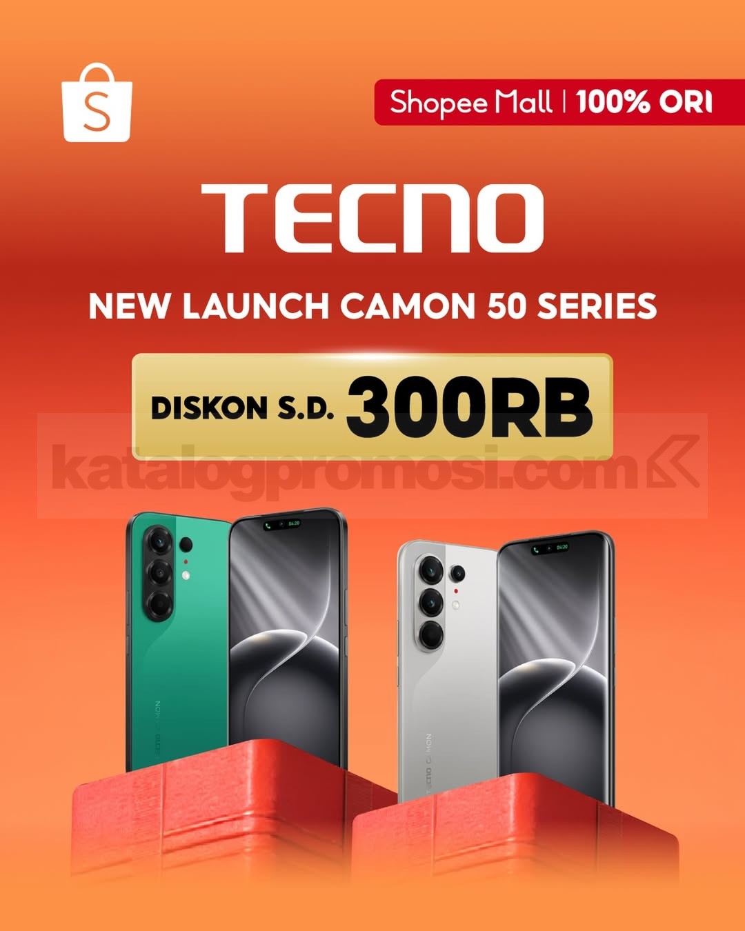 Promo TECNO CAMON 50 Series diskon hingga Rp. 300.000, performa bertenaga dan desain kece, berlaku mulai 17-31 Maret 2026 di Shopee Mall.