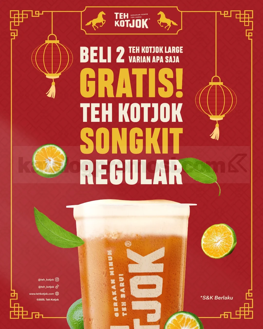 Promo Teh Kotjok Beli 2 Gratis 1 Minuman, beli 2 Large varian apa saja gratis 1 Regular berlaku selama periode promo berlangsung di seluruh outlet.