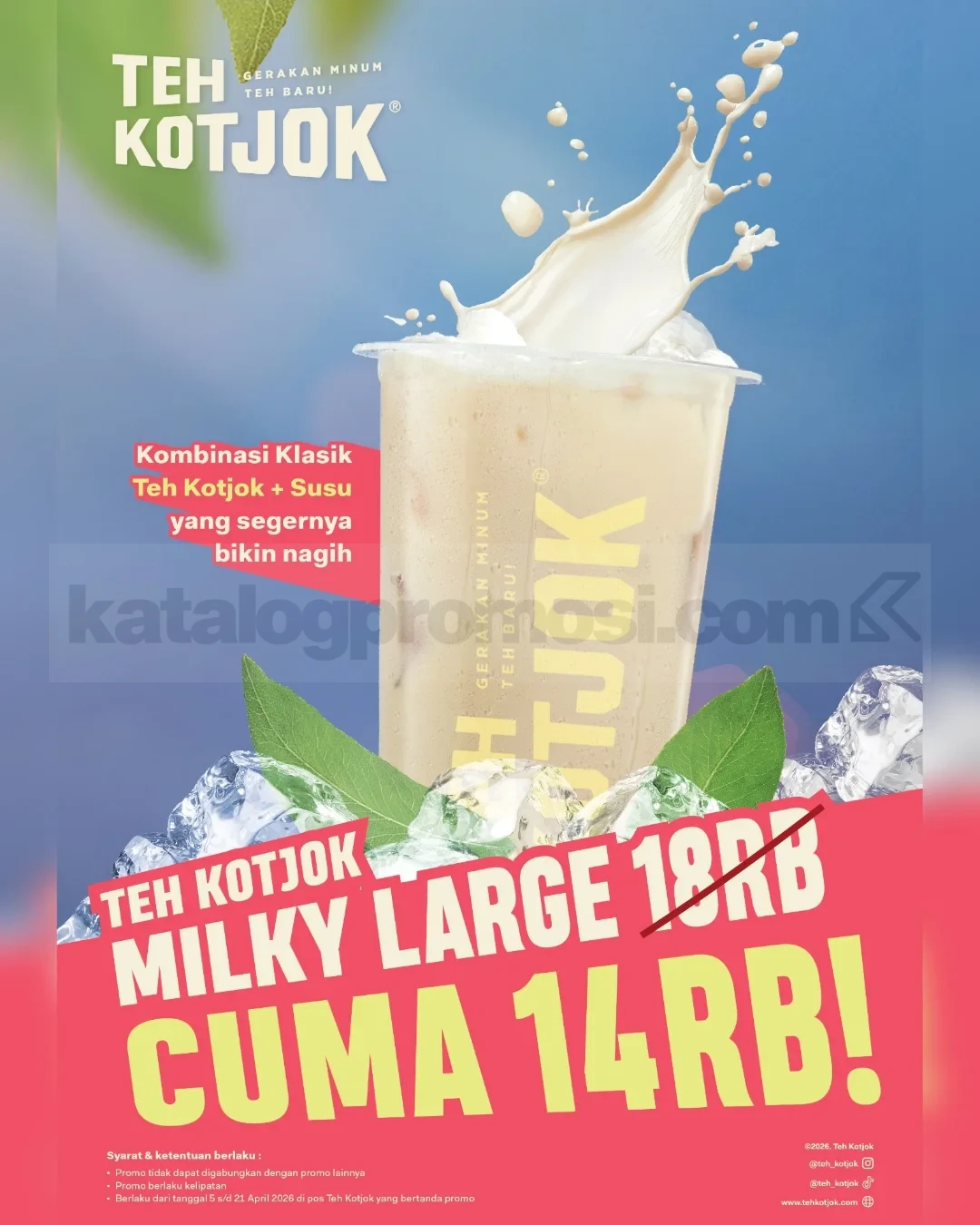 Promo Teh Kotjok Milky Large Rp. 14.000 dari harga normal nikmati teh susu segar favorit berlaku mulai tanggal 5 April 2026 – 21 April 2026