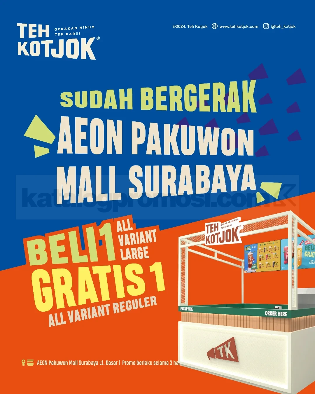 Promo Teh Kotjok Opening AEON Pakuwon Mall Surabaya beli 1 gratis 1 Teh Kotjok Large plus bonus bookmark berlaku selama 3 hari sejak tanggal pembukaan.