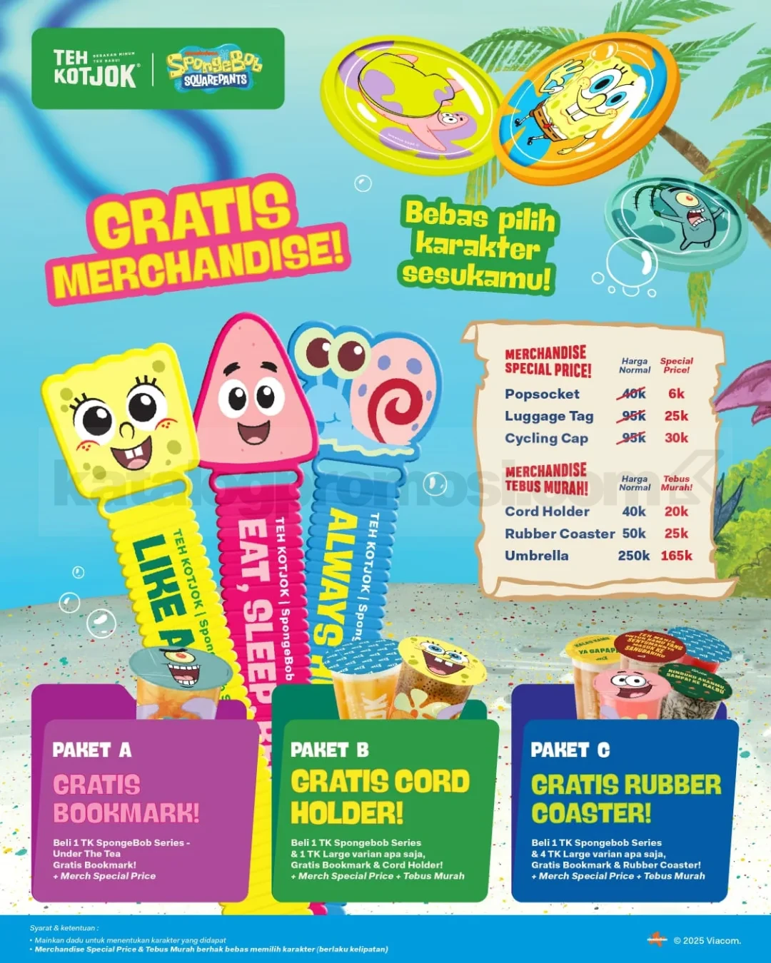 Keseruannya tidak berhenti di minuman saja. Promo Teh Kotjok Opening FX Sudirman Beli 1 Gratis 1 juga dibarengi koleksi merchandise Spongebob Squarepants series yang bisa dipilih sesuai karakter favorit. Mulai dari Spongebob, Patrick, sampai Plankton, semuanya menambah pengalaman jajan jadi lebih fun dan collectible.