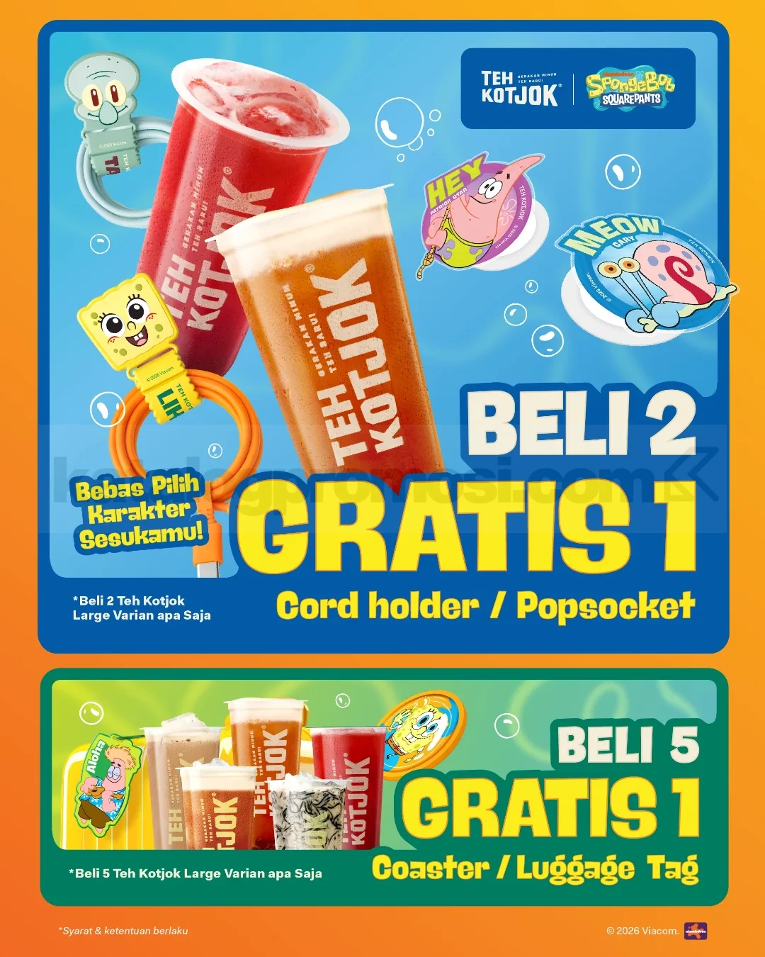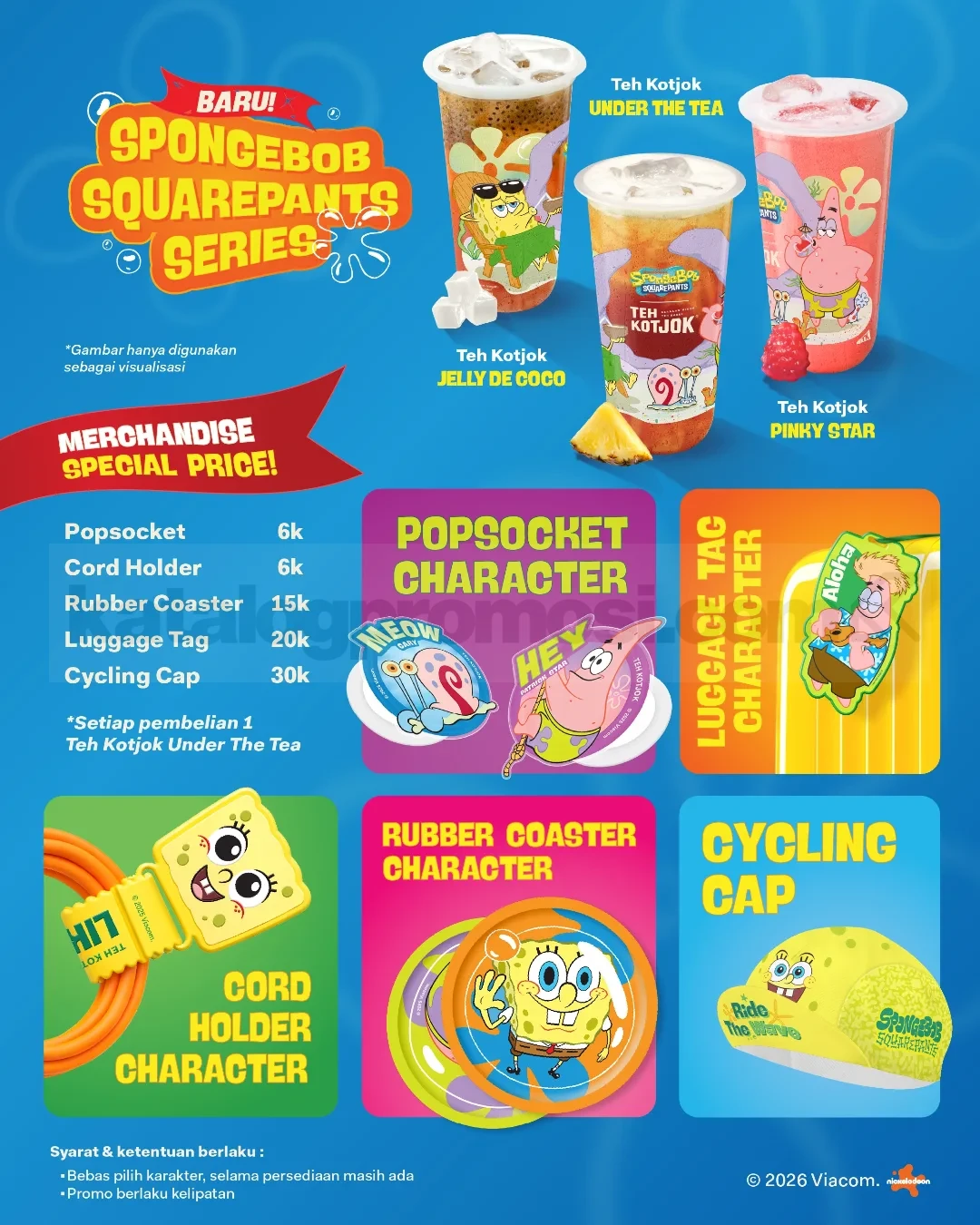 Selain promo minuman, tersedia juga merchandise karakter SpongeBob SquarePants dengan harga spesial bagi pembeli minuman Teh Kotjok. Merchandise ini bisa kamu dapatkan setelah melakukan pembelian minimal satu minuman Teh Kotjok Under The Tea.