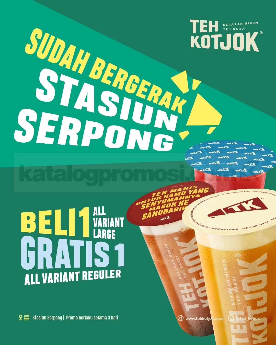 Promo Teh Kotjok Opening Stasiun Serpong Beli 1 Gratis 1 dengan bonus bookmark SpongeBob, beli ukuran Large gratis Regular, berlaku selama 3 hari di Stasiun Serpong.