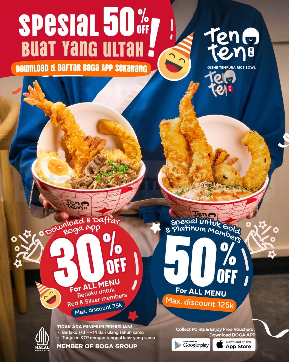 Potongan harga menyesuaikan level member di BOGA App. Red dan Silver Member dapat diskon 30% dengan maksimum potongan 75.000, sedangkan Gold dan Platinum Member menikmati diskon 50% dengan maksimum potongan 125.000. Mulai dari tempura rice bowl yang light dan crispy sampai menu favorit lainnya, semuanya ikut promo ulang tahun ini.