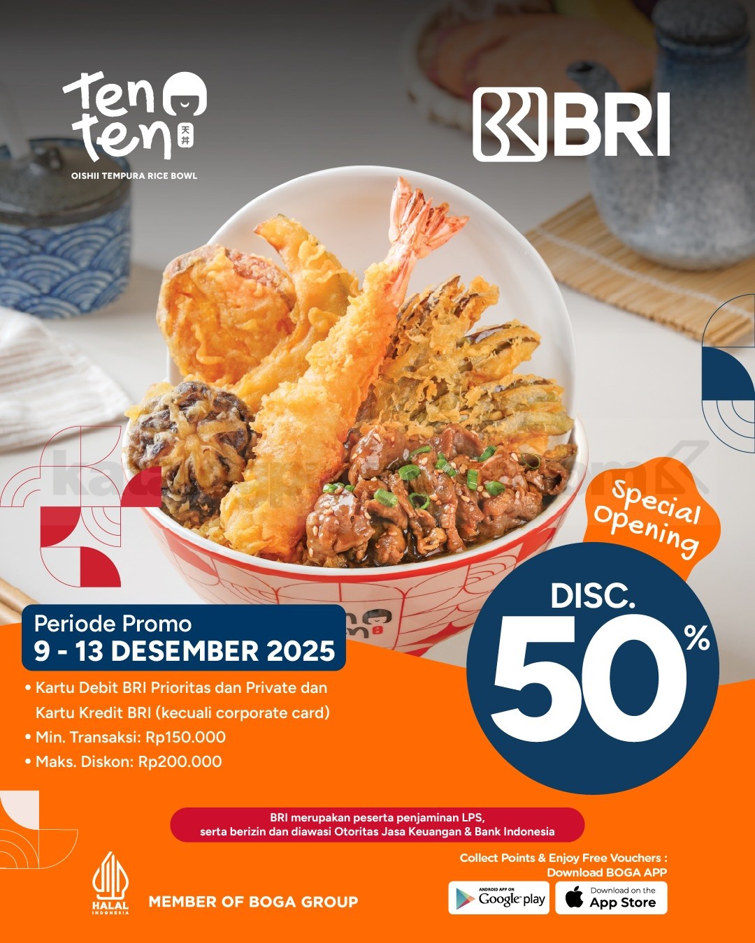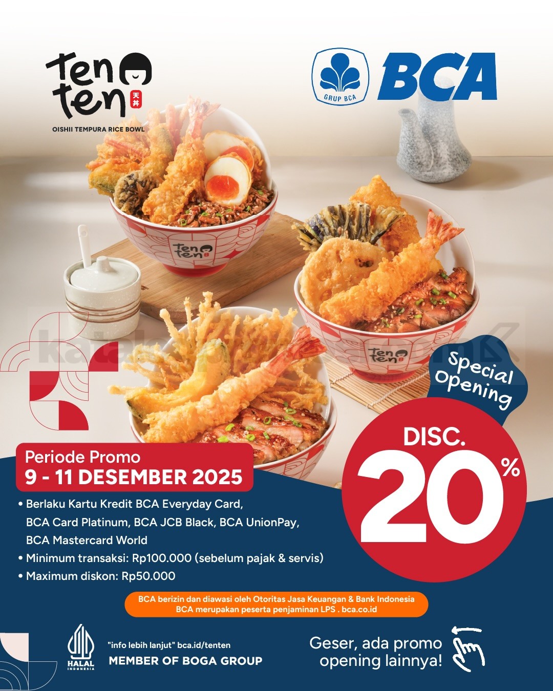 DEPOK! Ada promo spesial Opening TenTen buat kamu yang pengin cobain Oishii Tempura Rice Bowl langsung di Margo City. Selama beberapa hari, ada dua jenis promo berbeda yang bisa dipakai sesuai kartu pembayaran yang kamu punya. Mulai dari diskon 20% untuk pemegang kartu BCA tertentu sampai potongan 50% buat pengguna kartu debit dan kredit BRI yang memenuhi syarat transaksi.