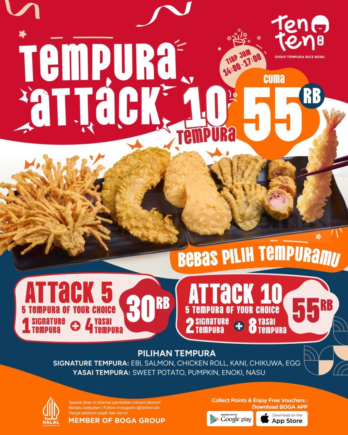Promo TENTEN Tempura Attack 10pcs Rp. 55.000 periode April 2026 setiap hari pukul 14.00 – 17.00 tersedia paket tempura pilihan bebas di outlet tertentu.