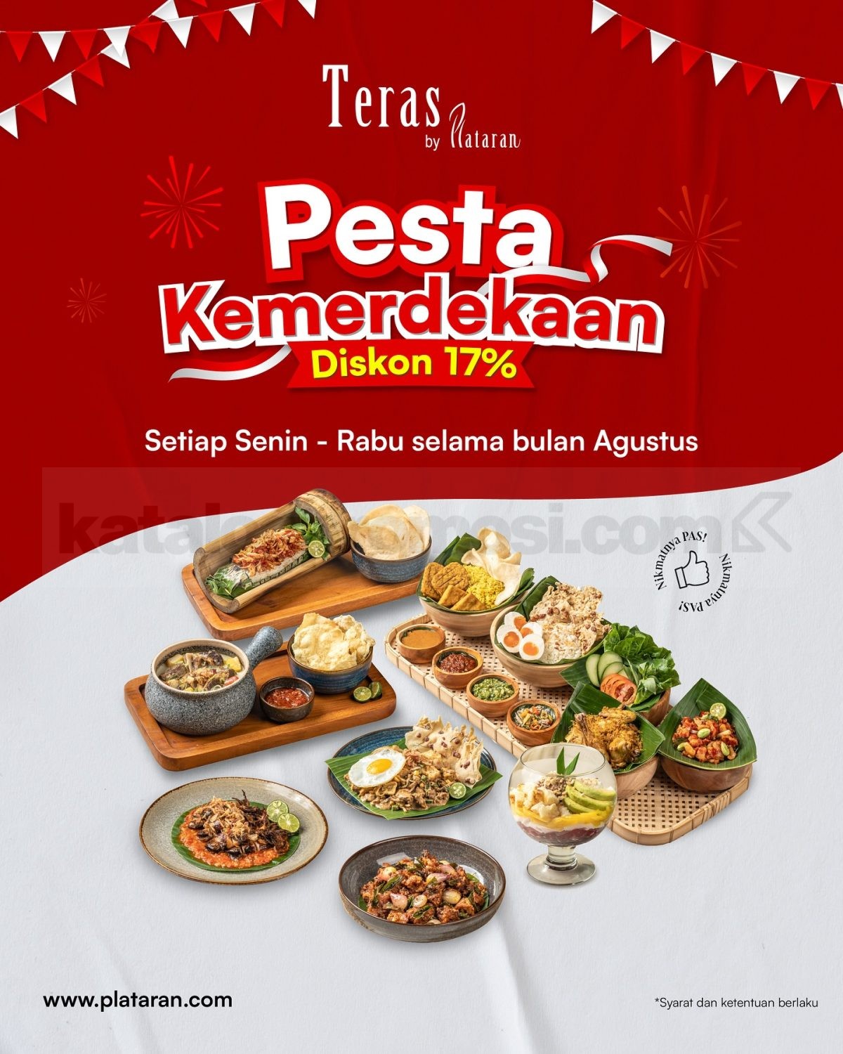 Promo Teras by Plataran Pesta Kemerdekaan diskon 17% berlaku selama bulan Agustus setiap Senin hingga Rabu dengan hidangan istimewa yang nikmat dan suasana hangat.