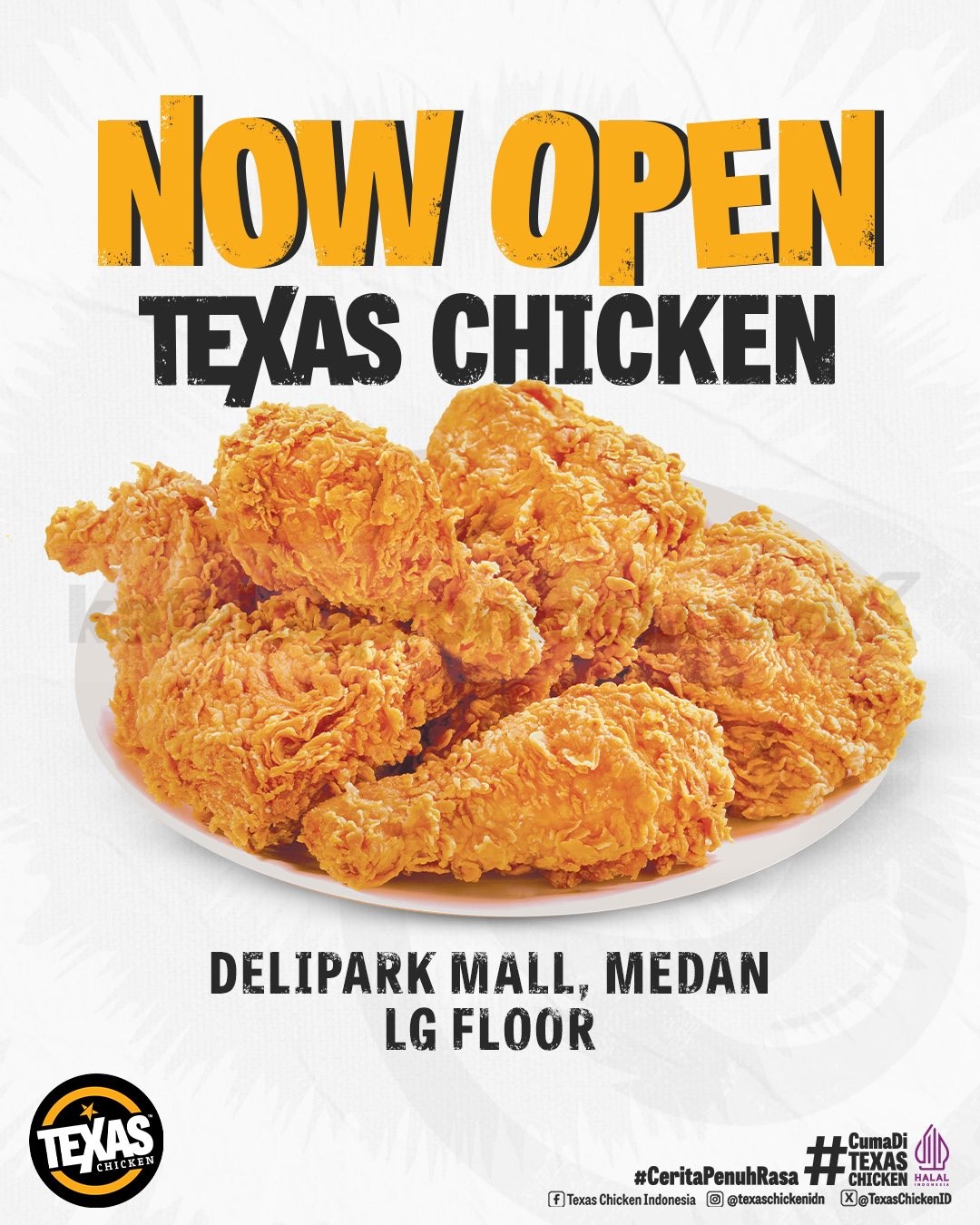 Promo Texas Chicken Grand Opening Spesial Deal mulai Rp. 30.000 dengan gratis makan 1 tahun dan voucher Rp50.000, berlaku opening di DeliPark Mall Medan.