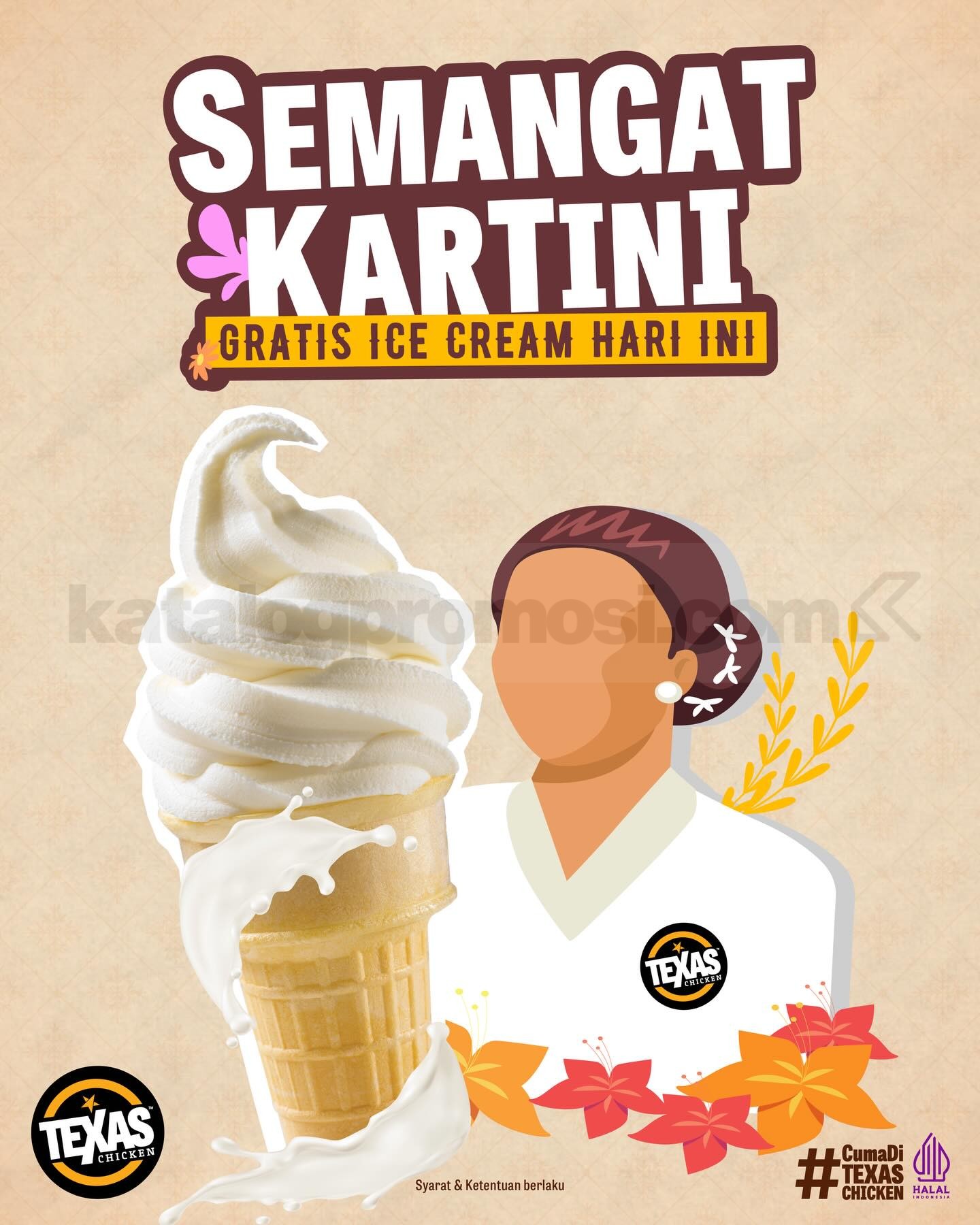 Promo Texas Chicken Hari Kartini Gratis Ice Cream untuk 20 perempuan pertama dengan follow sosial media berlaku 21 April 2026.