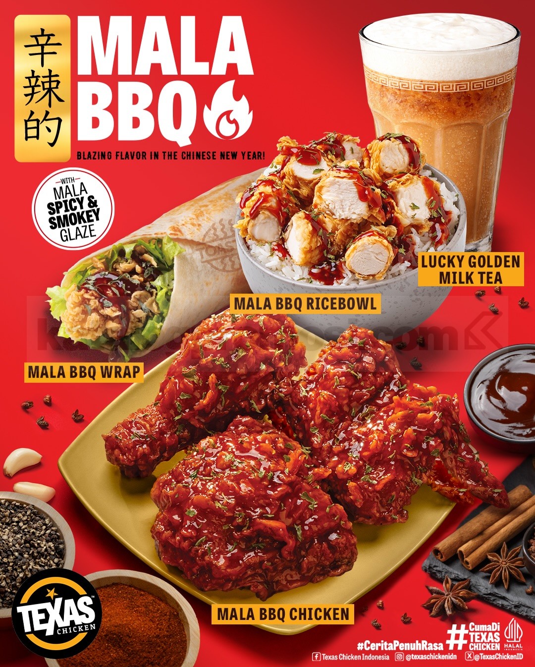 Promo TEXAS CHICKEN NEW Mala BBQ Series hadir dengan menu pedas mala berpadu saus BBQ smokey, tersedia Chicken, Ricebowl, Wrap, dan Lucky Golden Milk Tea.