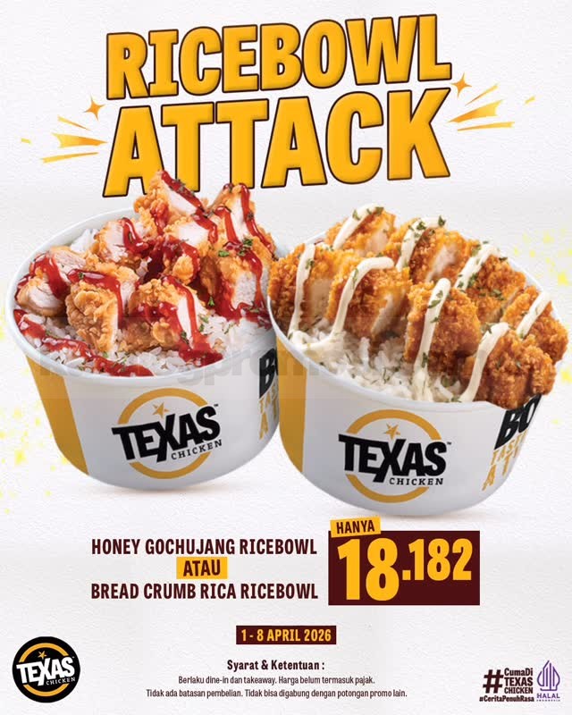 Promo Texas Chicken Ricebowl Attack mulai Rp. 18.182 dengan pilihan menu favorit, berlaku mulai tanggal 1 April 2026 – 8 April 2026 di seluruh outlet