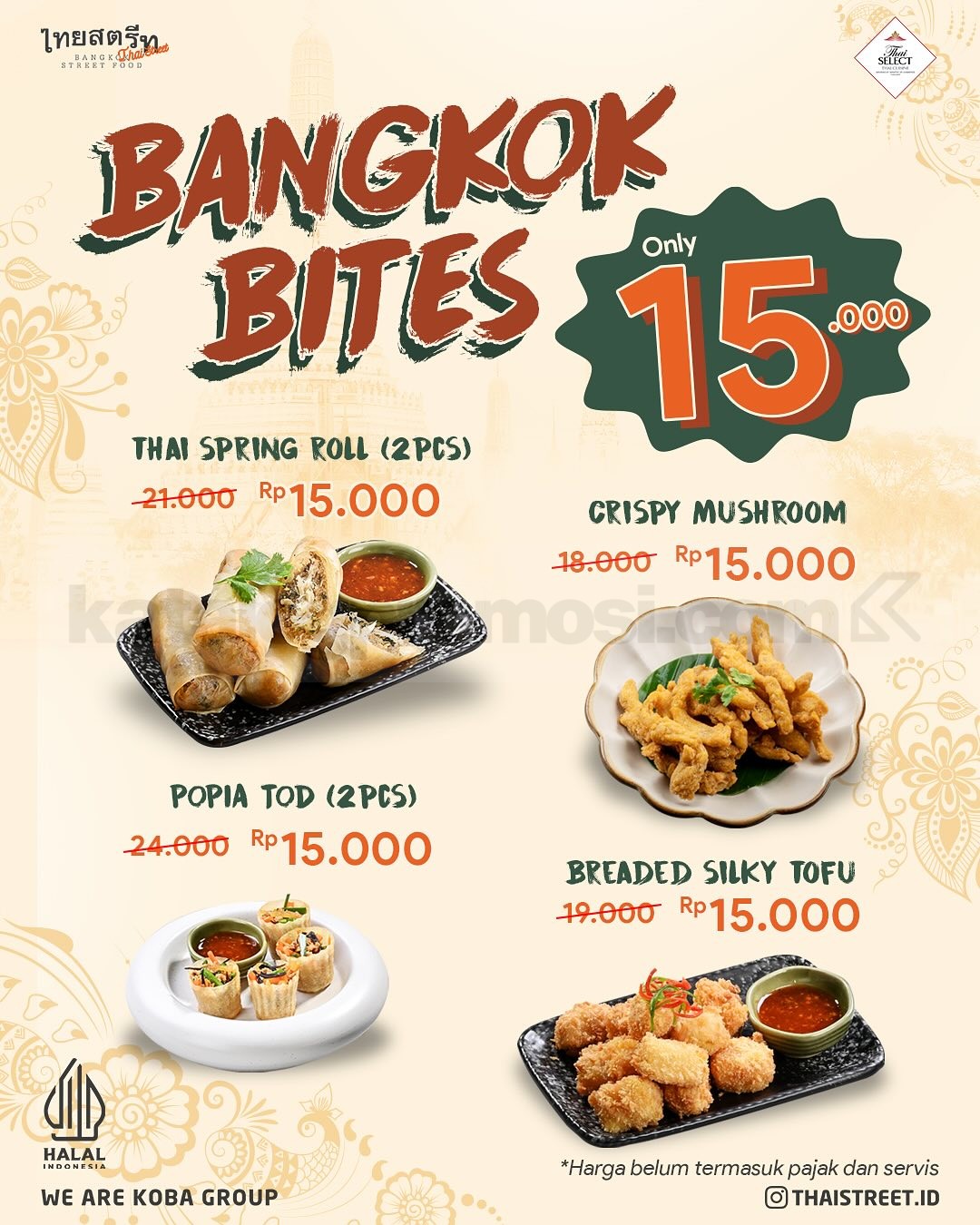 Promo Thai Street Bangkok Bites cuma Rp15.000! Coba camilan khas Thailand seperti spring roll, tofu, dan mushroom. Harga hemat, belum termasuk pajak.