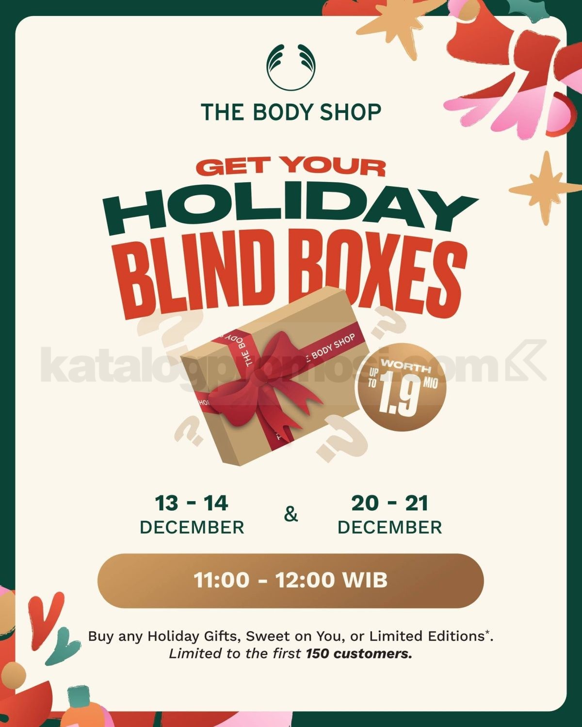 Promo THE BODY SHOP Free Blind Box senilai hingga Rp. 1.900.000 berlaku di tanggal 13–14 dan 20–21 Desember 2025 pukul 11.00–12.00 WIB untuk pembelian produk tertentu di store.