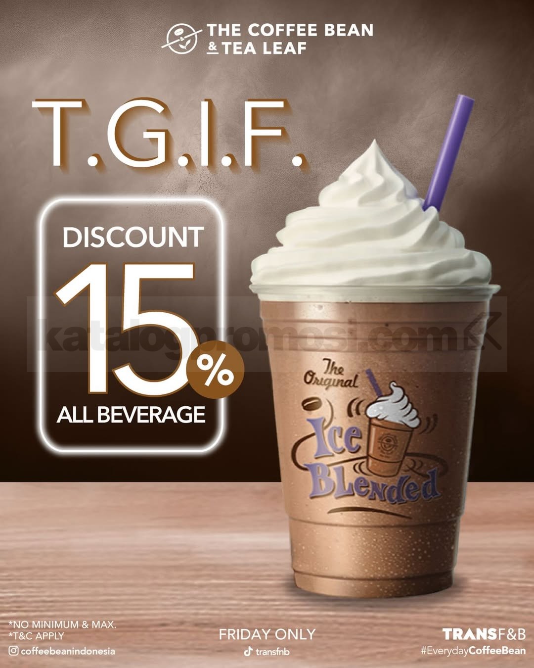 Kick off the weekend dengan minuman favorit dari The Coffee Bean & Tea Leaf ☕💜. Promo The Coffee Bean T.G.I.F Diskon 15% Semua Minuman jadi kesempatan seru untuk menikmati berbagai pilihan kopi, teh, dan minuman segar dengan harga lebih hemat setiap hari Jumat.