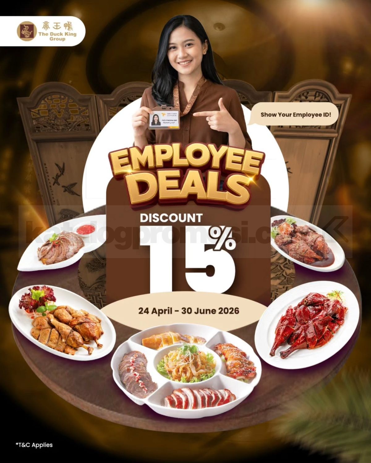 Promo The Duck King Employee Deals diskon 15% untuk karyawan dengan kartu aktif, dine-in weekdays berlaku mulai tanggal 24 April 2026 – 30 Juni 2026 di lokasi tertentu.