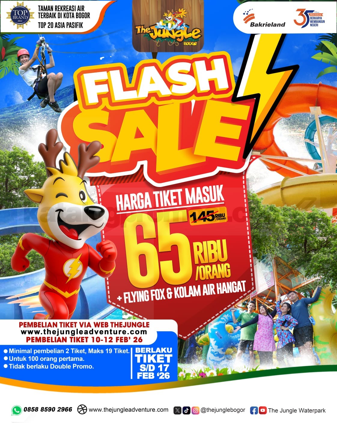 Promo The Jungle Bogor Flash Sale tiket Rp. 65.000 sudah termasuk wahana dan kolam air hangat berlaku pembelian 10 – 12 Februari 2026 secara online.