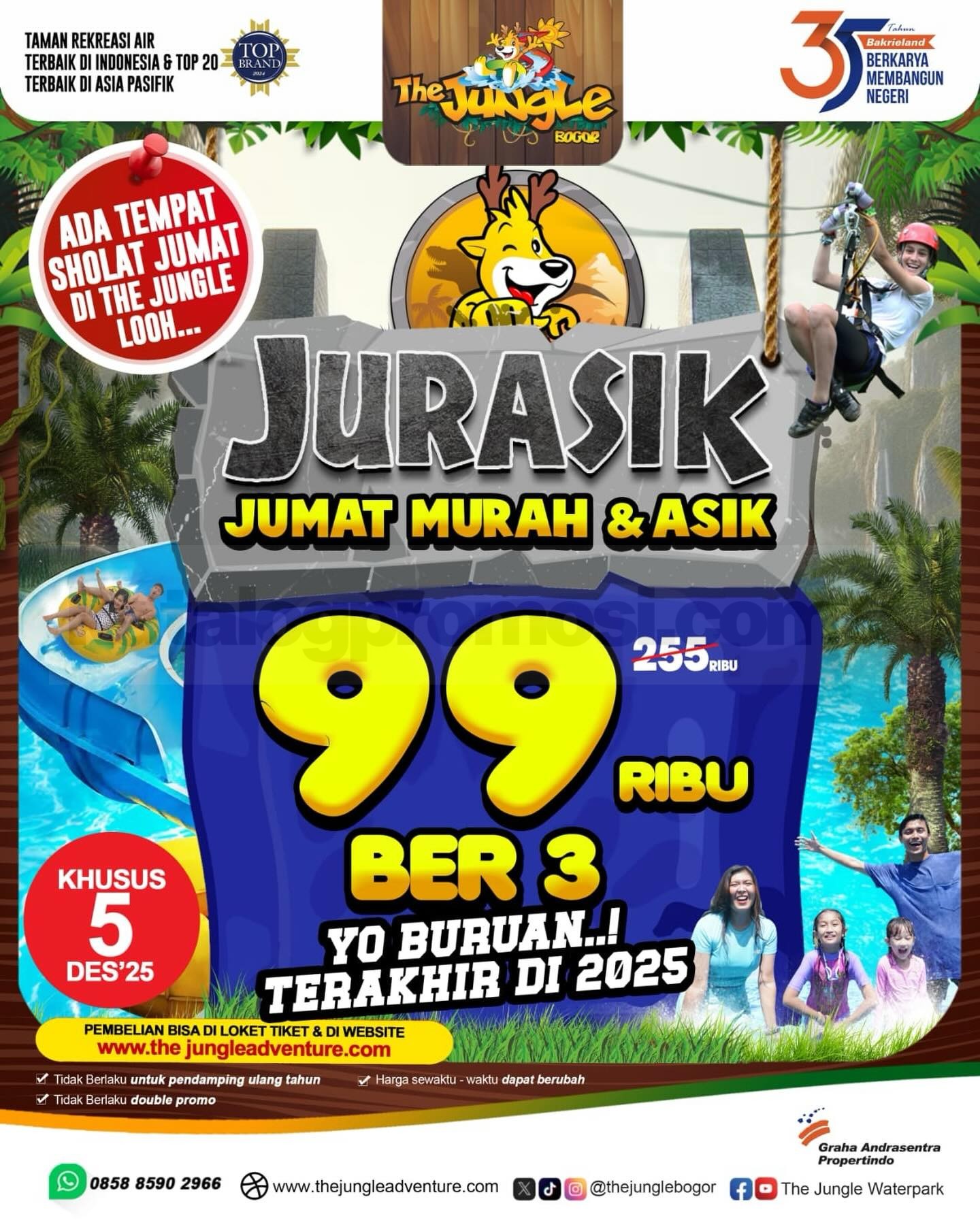 Promo The Jungle Jurasik Jumat Murah & Asik Rp. 99.000 Bertiga untuk masuk 3 orang berlaku 5 Desember 2025 di The Jungle Bogor.