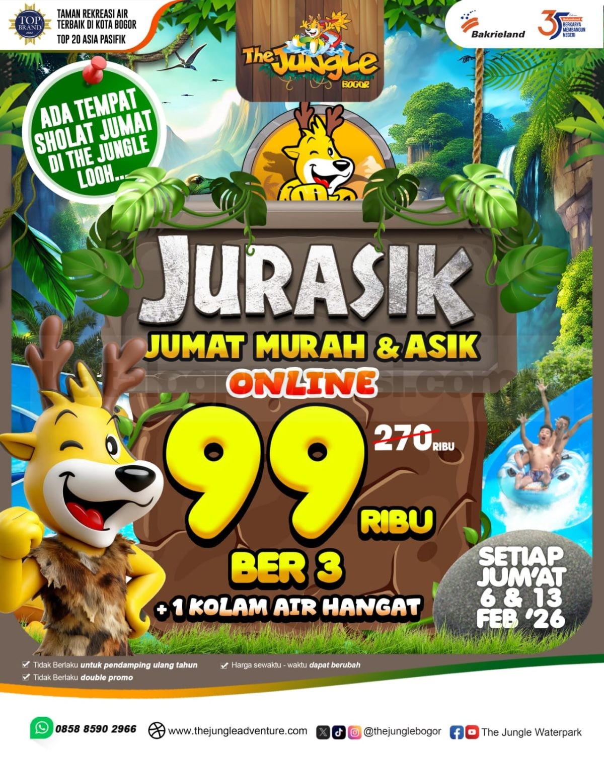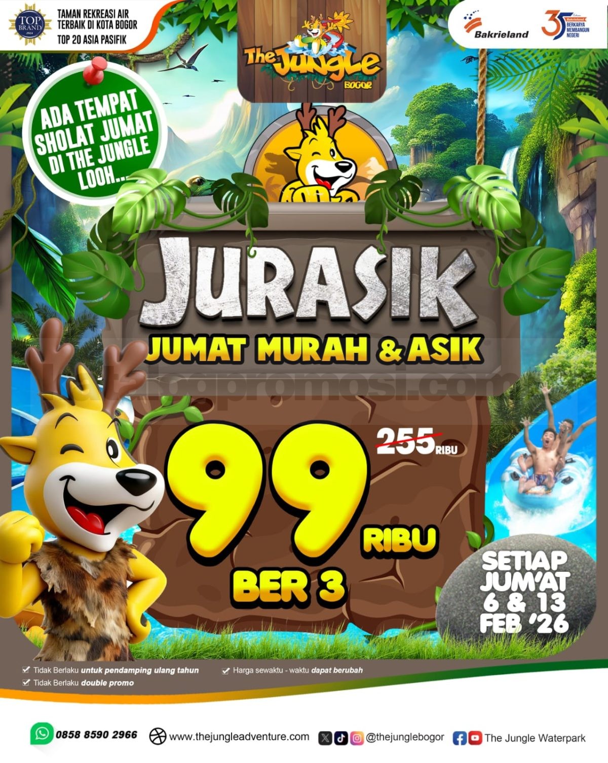 Promo The Jungle JURASIK Jumat Murah Ber 3 Rp. 99.000 main bertiga lebih hemat dengan opsi bonus kolam air hangat, berlaku mulai tanggal 6 Februari 2026 – 13 Februari 2026.