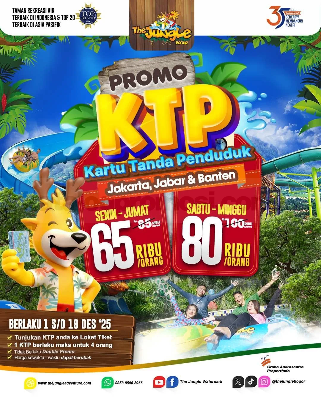 Cukup tunjukkan KTP, 1 KTP berlaku untuk maksimal 4 orang. Harga weekday mulai Rp. 65.000 dan weekend Rp. 80.000. Periode 1โ19 Desember 2025.