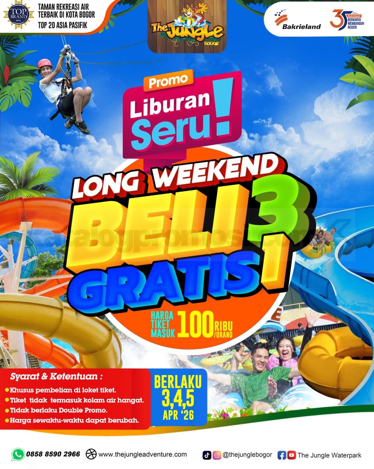Promo The Jungle Long Weekend Beli 3 Gratis 1 Tiket dengan harga Rp. 100.000/orang beli 3 tiket dapat 4 tiket berlaku mulai tanggal 3 April 2026 – 5 April 2026.