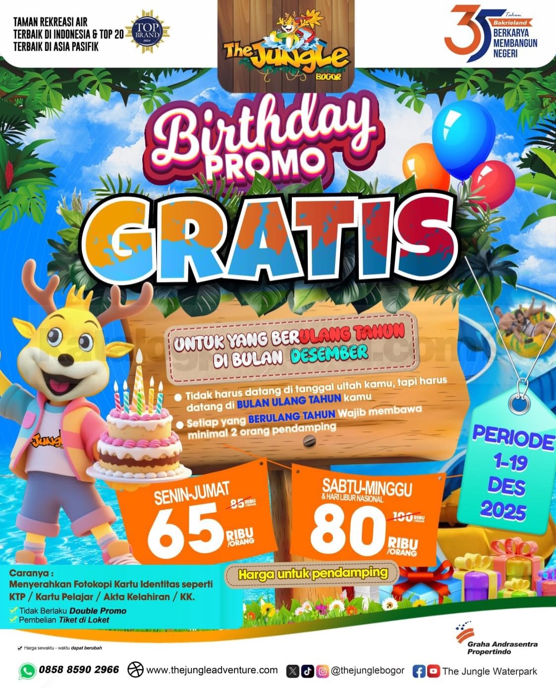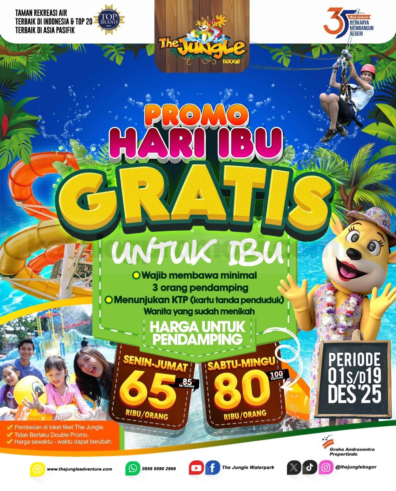 Jangan tunggu lama! Bawa keluarga dan teman-temanmu, rasakan sensasi liburan seru, dan manfaatkan promo GRATIS tiket masuk untuk Ibu & ulang tahun di The Jungle Waterpark Bogor. ๐๐
