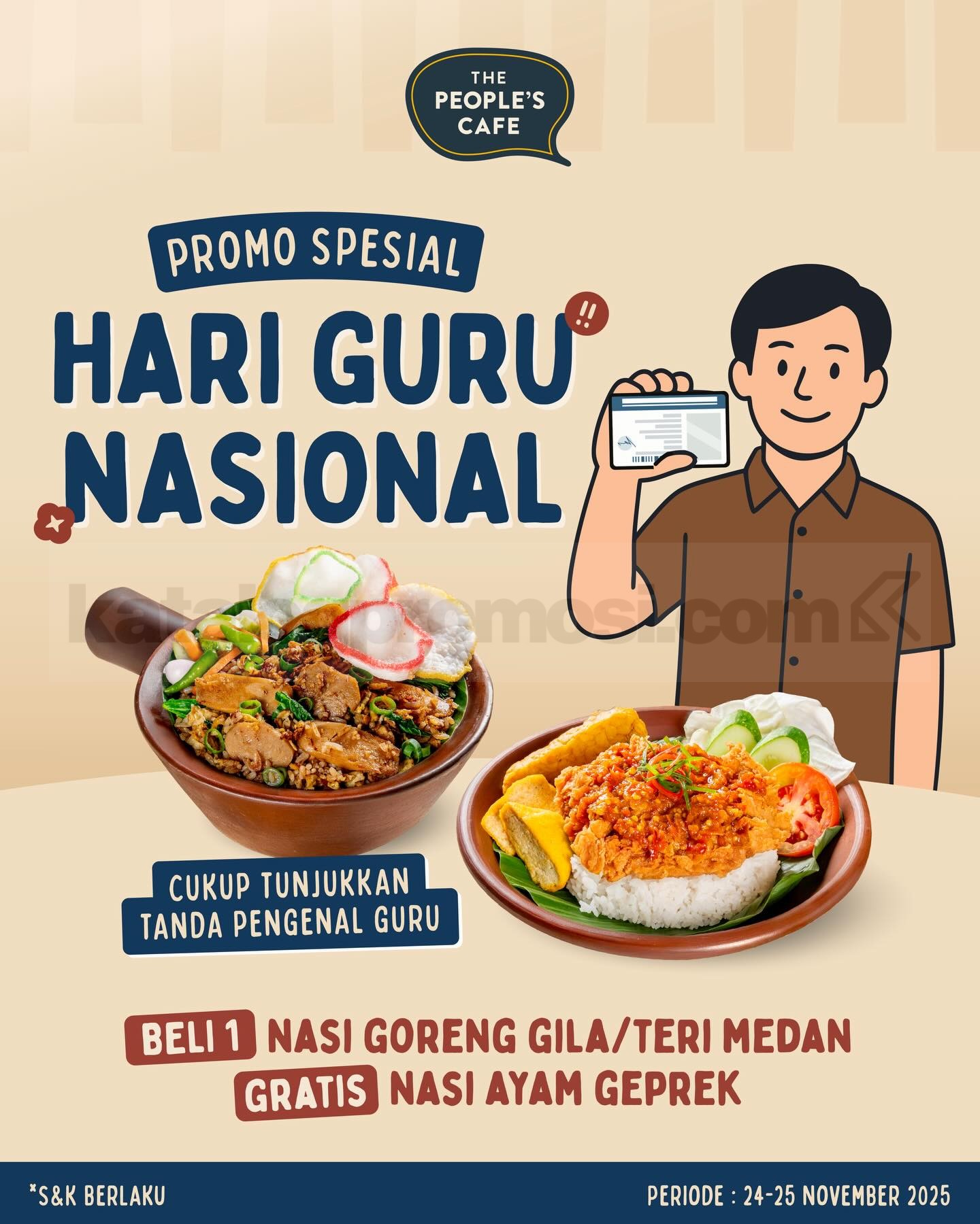Rayakan Hari Guru Nasional dengan manis dari The People’s Cafe! 🥳 Dalam promo Hari Guru, setiap guru bisa menikmati Beli 1 Nasi Goreng Gila/Teri Medan, Gratis 1 Nasi Ayam Geprek. Kesempatan ini jadi cara seru dan lezat untuk memberi apresiasi bagi guru di seluruh Indonesia.