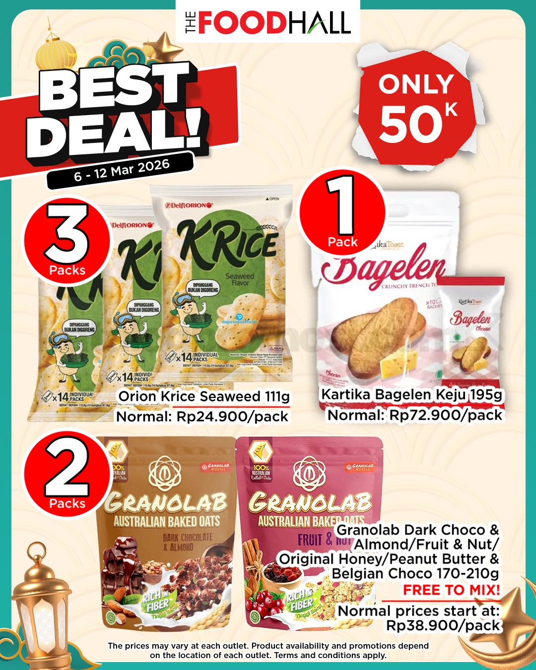 Jangan lewatkan Promo TheFoodhall Promo Weekend Surprise mulai dari tanggal 06-12 Maret 2026! Beragam produk pilihan hadir dengan harga spesial Rp 50.000 dan Rp 100.000 di TheFoodhall dan Daily Supermarket. Waktunya kamu belanja hemat tanpa mengorbankan kualitas, mulai dari kebutuhan dapur, makanan segar, hingga perlengkapan rumah.