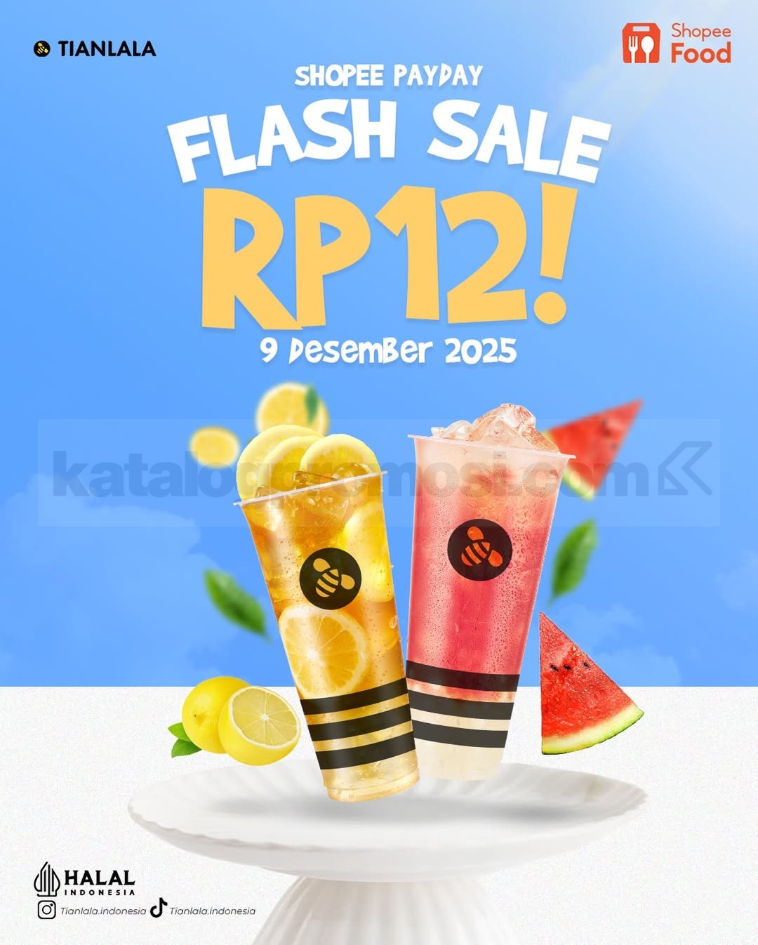 Promo Tianlala Shopee Payday Flash Sale Minuman Favorit Rp. 12,- untuk Watermelon Explosion & Ice Lemon Tea, berlaku 09 Desember 2025, kuota terbatas.