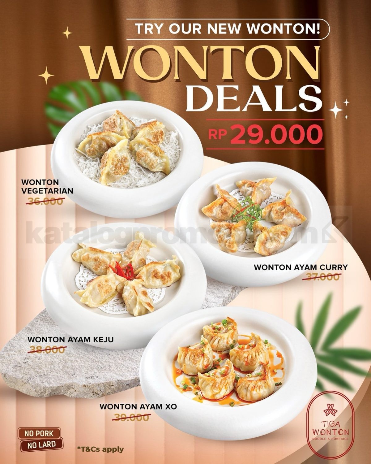Promo Tiga Wonton – Wonton Deals hanya Rp29K/Portion dengan minimal pembelian 200K, berlaku hingga 30 November 2025.