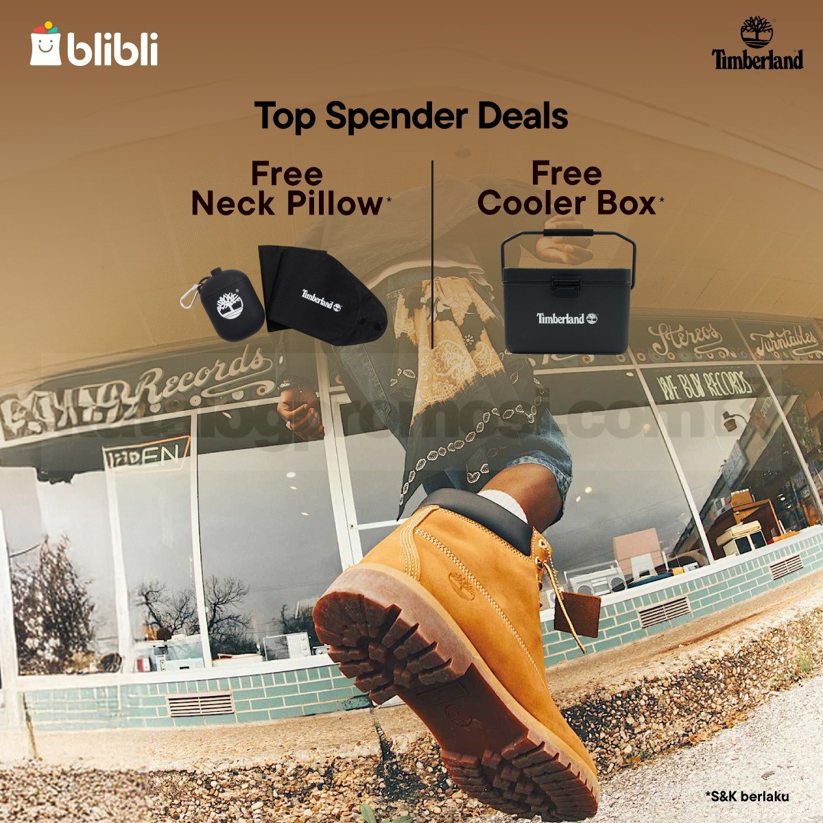 Promo Timberland di Blibli TOP SPENDER DEALS! GRATIS Neck Pillow dan Cooler Box.