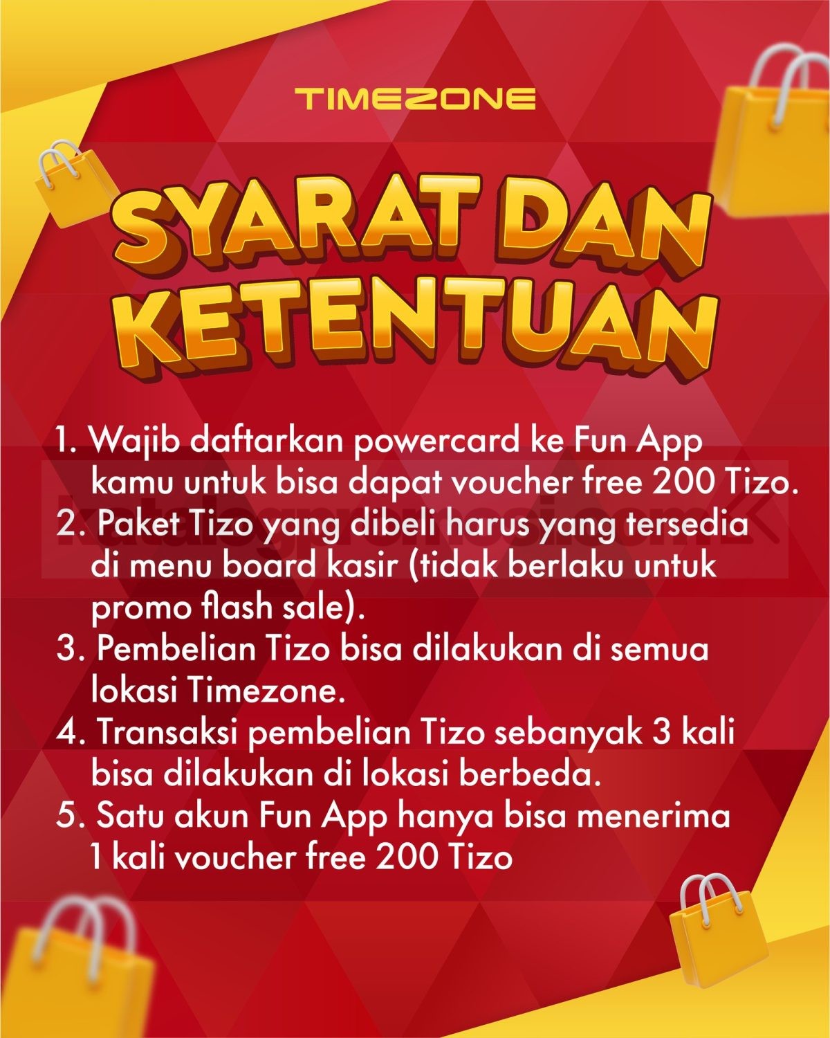 - Pembelian Tizo bisa dilakukan di semua lokasi Timezone.