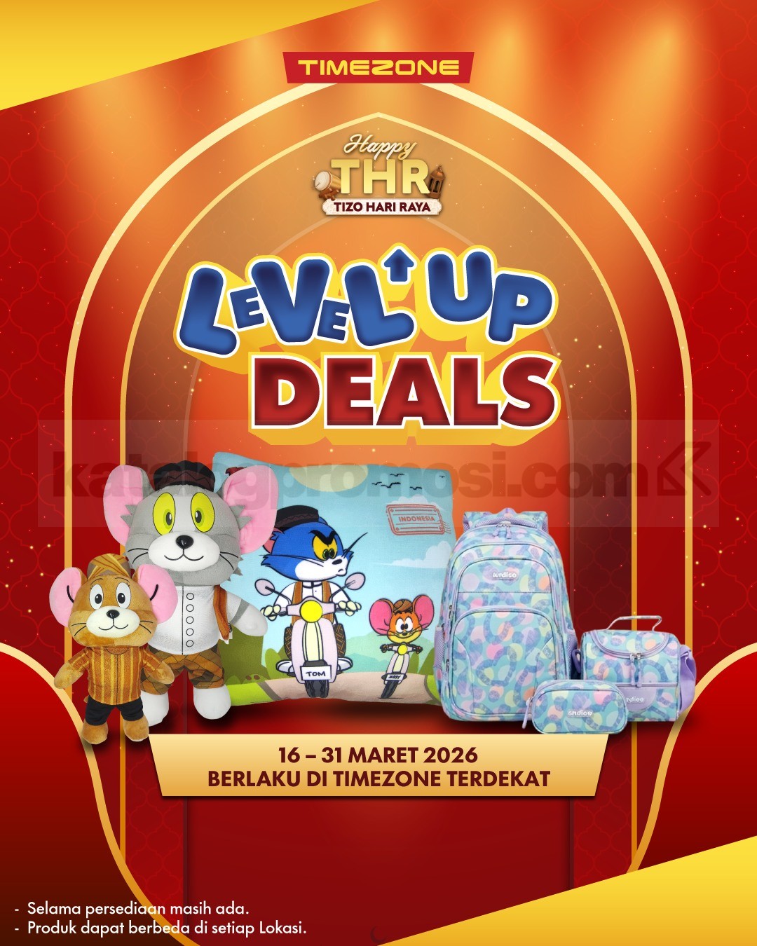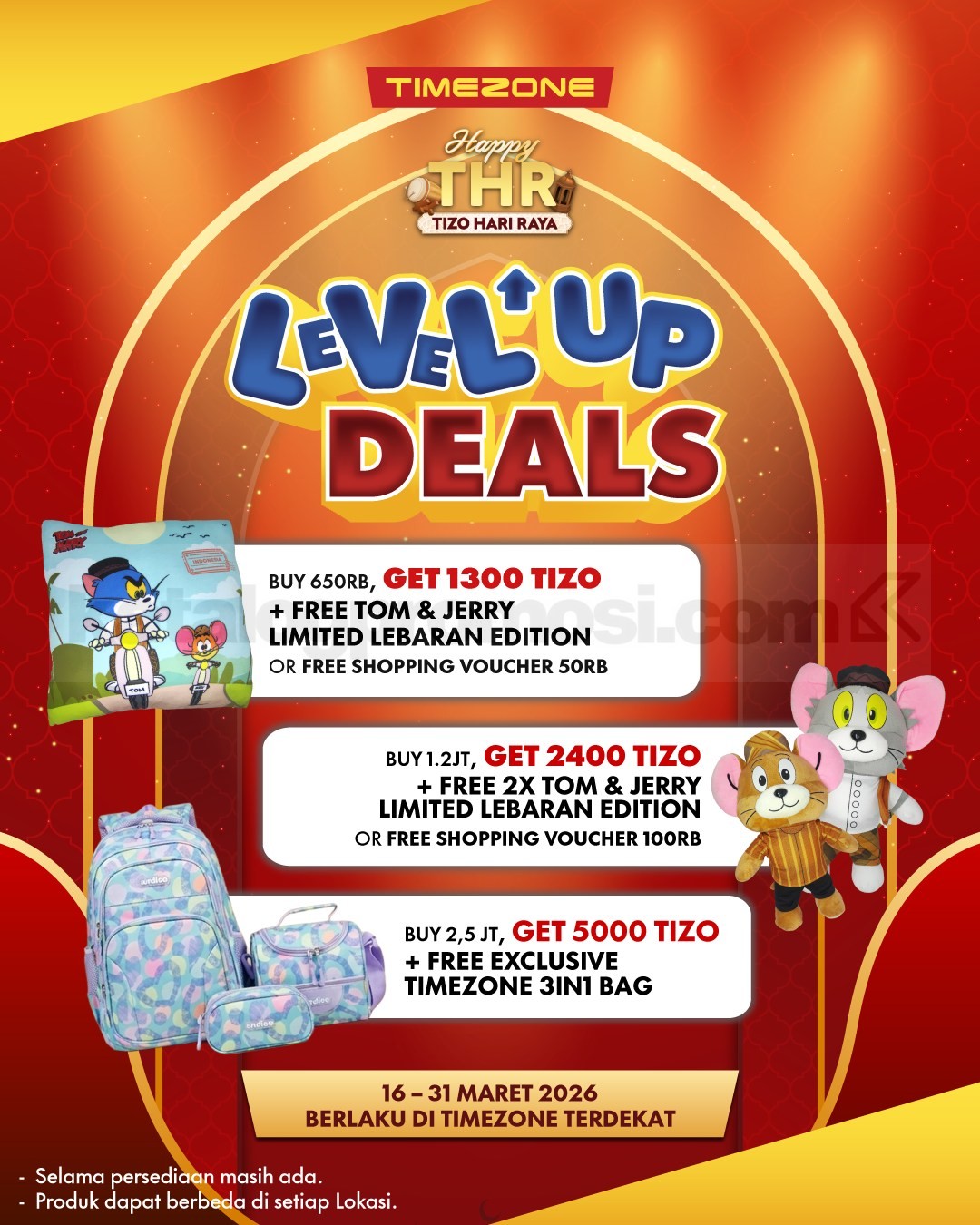 Timezone Happy THR Tizo Hari Raya Level Up Deals jadi kesempatan seru buat kamu yang ingin bermain di Timezone sambil membawa pulang official merchandise Tom & Jerry edisi Lebaran. 😍✨ Melalui Promo Timezone Happy THR Tizo Free Merchandise Tom & Jerry ini, setiap pembelian paket Tizo akan memberikan tambahan Tizo sekaligus hadiah menarik yang bisa langsung didapat di kasir Timezone.