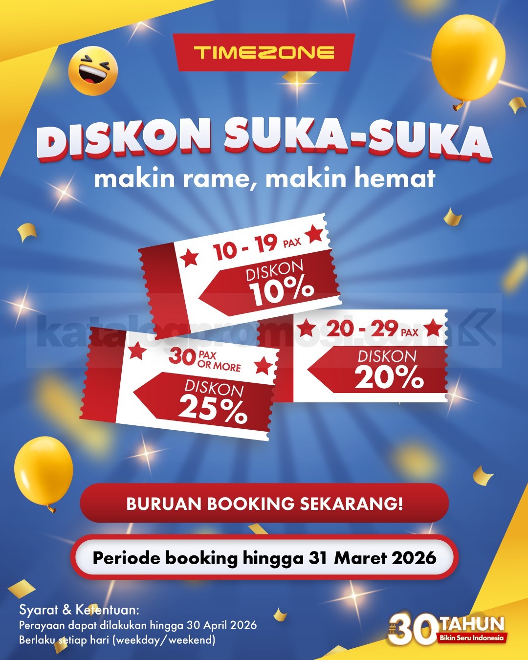 Promo ini adalah penawaran paket party ramean di Timezone dengan diskon bertingkat hingga 25% sesuai jumlah peserta.