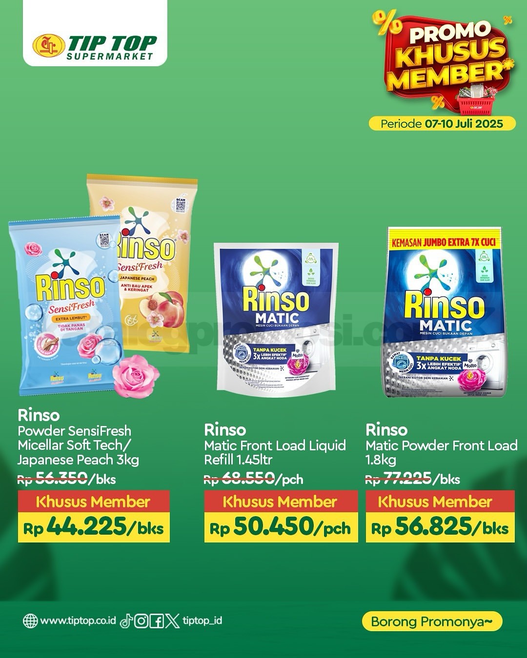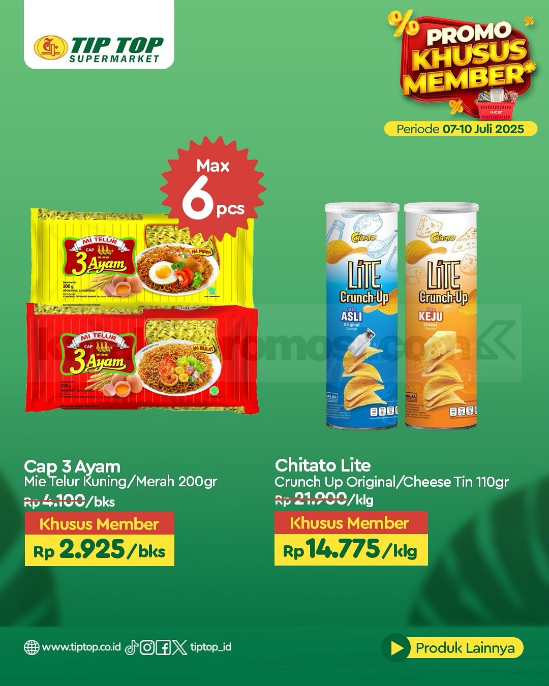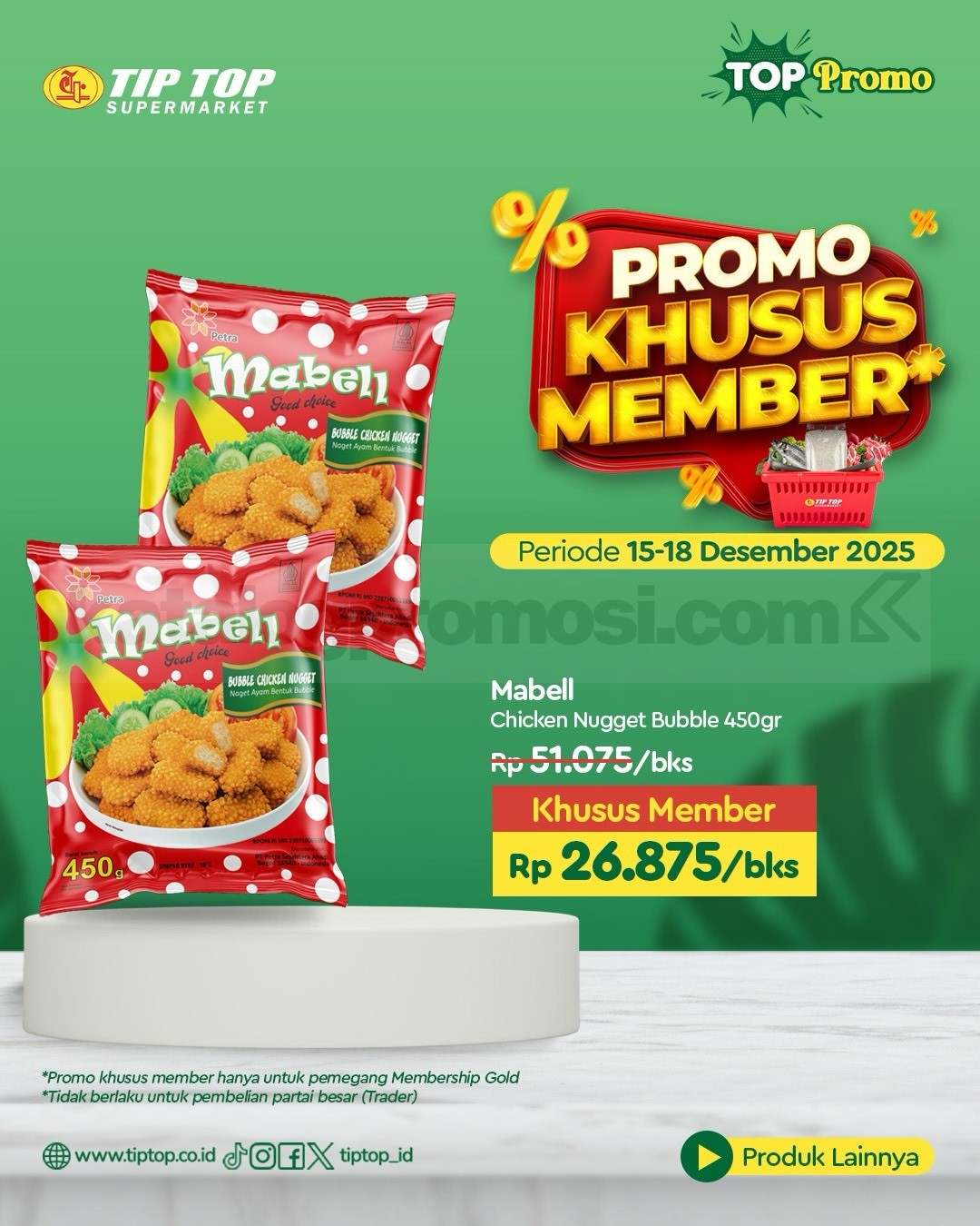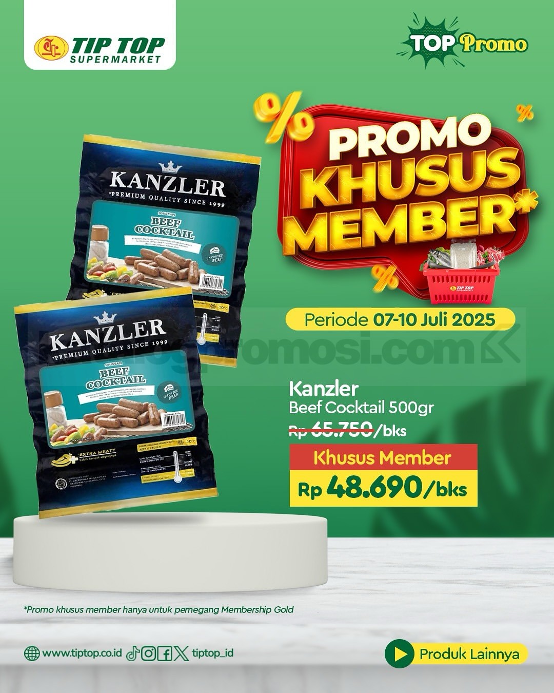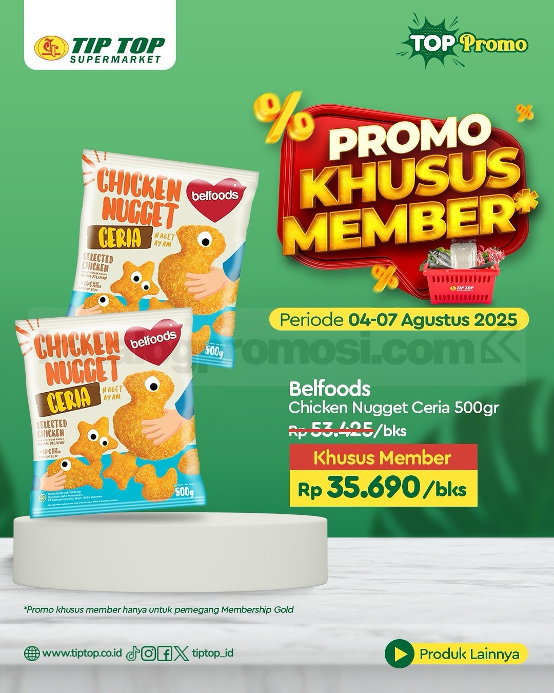 Promo ini berlaku di seluruh cabang TIP TOP Supermarket dan juga online di shop.tiptop.co.id. Khusus untuk member TIP TOP GOLD. Daftar bisa lewat WhatsApp 0812-2080-2080 atau kunjungi tiptop.co.id/membership.