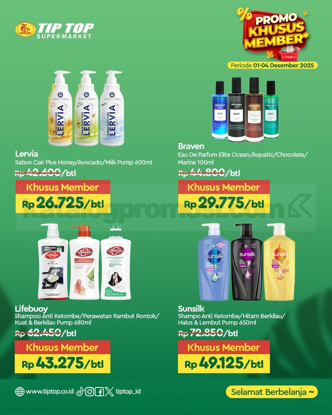 Promo TIP TOP Swalayan Khusus Member Periode 01-04 Desember 2025 hadir dengan diskon minyak goreng, lotion, susu, dan kebutuhan rumah
