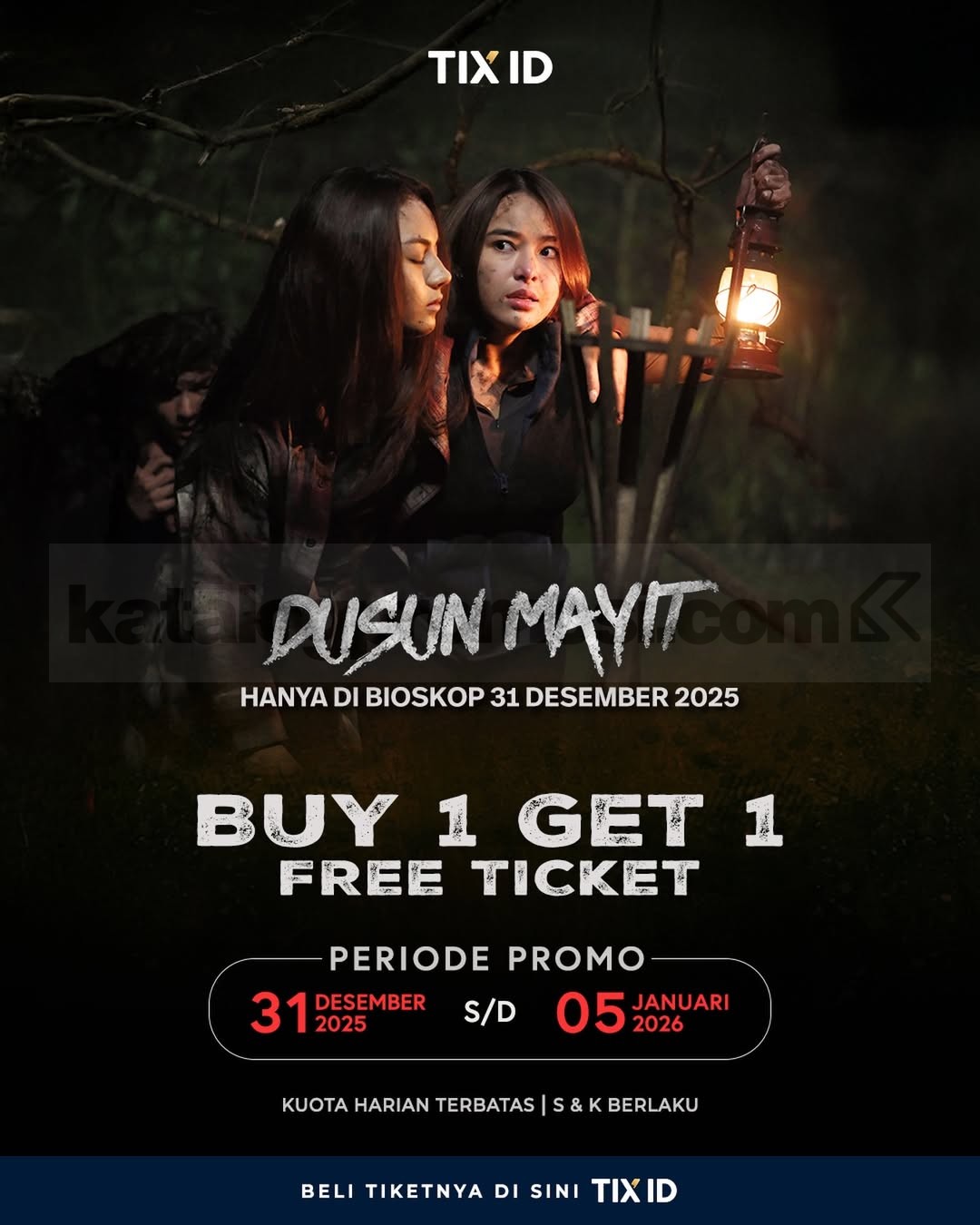 Promo ini berlaku khusus untuk film Dusun Mayit dan bisa dinikmati selama periode akhir tahun hingga awal Januari. Setiap pembelian tiket nonton Dusun Mayit melalui aplikasi atau website TIX ID otomatis mendapatkan satu tiket tambahan tanpa biaya. Mekanismenya simpel dan cocok buat kamu yang pengen nonton rame-rame, entah bareng pasangan, sahabat, atau keluarga.