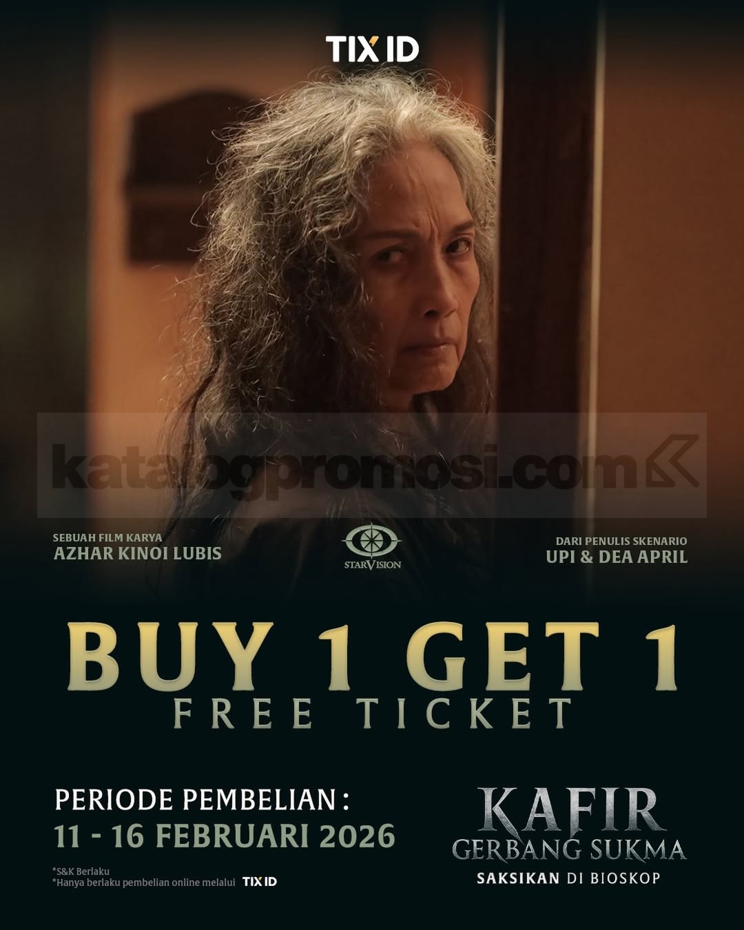 Promo TIX ID Beli 1 Gratis 1 Tiket Kafir Gerbang Sukma diskon setara 1 tiket via aplikasi berlaku mulai tanggal 11 Februari 2026 – 16 Februari 2026 di seluruh bioskop