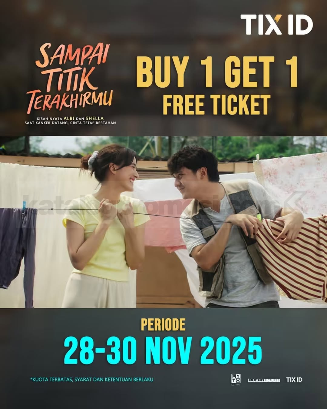 Promo TIX ID Beli 1 Gratis 1 Tiket film Sampai Titik Terakhirmu untuk minimal 2 tiket, berlaku 28 – 30 November 2025, semua lokasi bioskop.