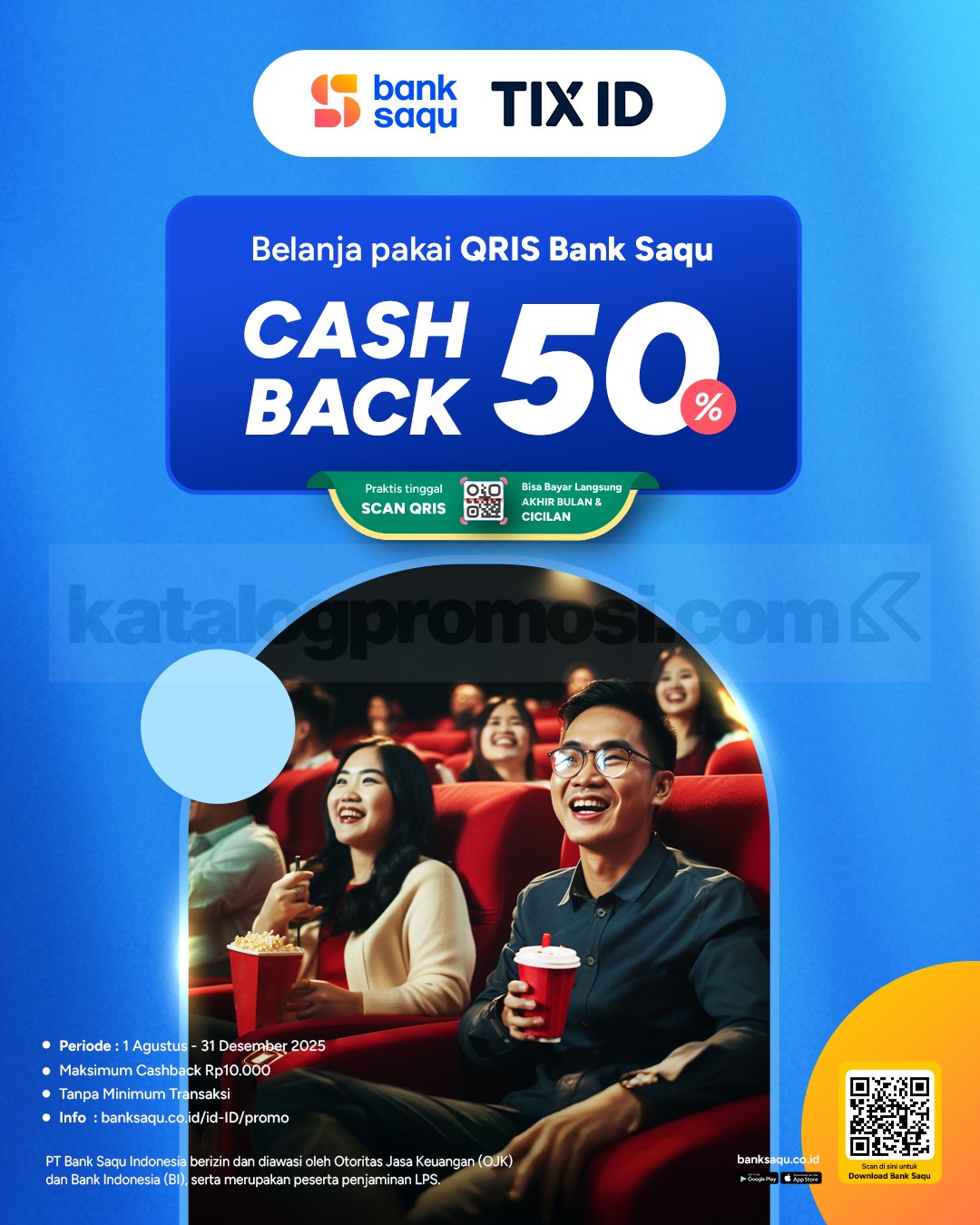 Promo TIX ID x Bank Saqu Cashback QRIS 50% tanpa minimum transaksi berlaku 1 Agustus–31 Desember 2025 untuk pembelian tiket nonton di aplikasi TIX ID.