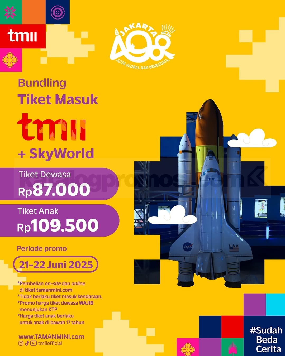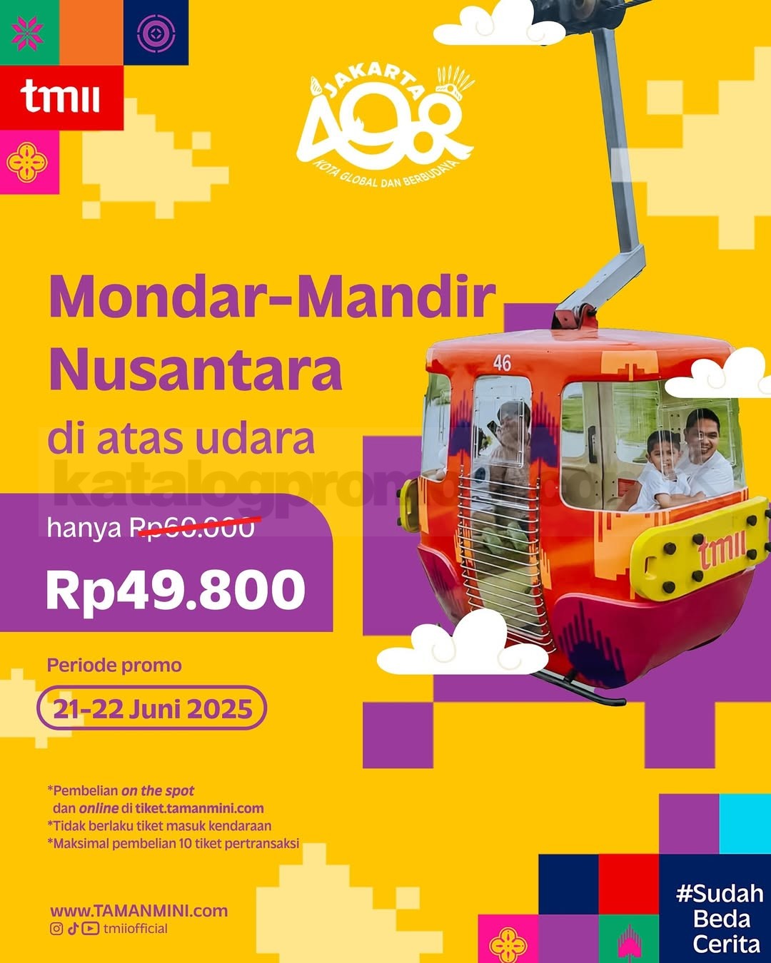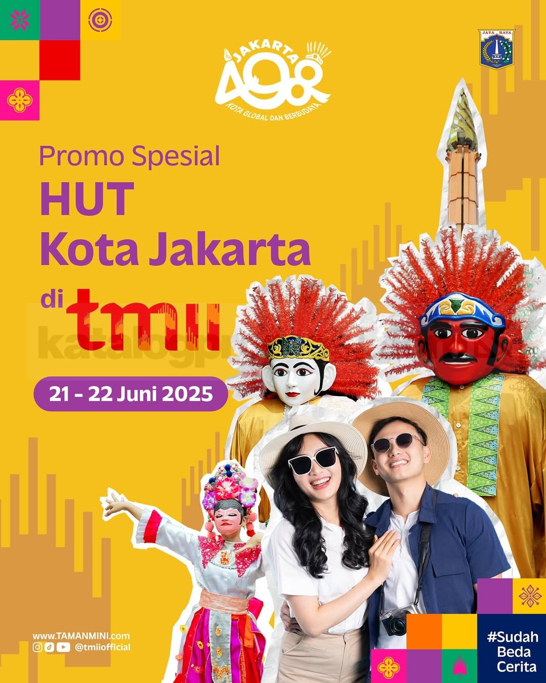 Rayakan ulang tahun Jakarta ke-498 bareng TMII yang #SudahBedaCerita! Selama 21–22 Juni 2025, kamu bisa eksplorasi wahana, beli merchandise, atau sekadar menikmati suasana budaya yang makin modern dengan harga spesial. Ini dia promonya: