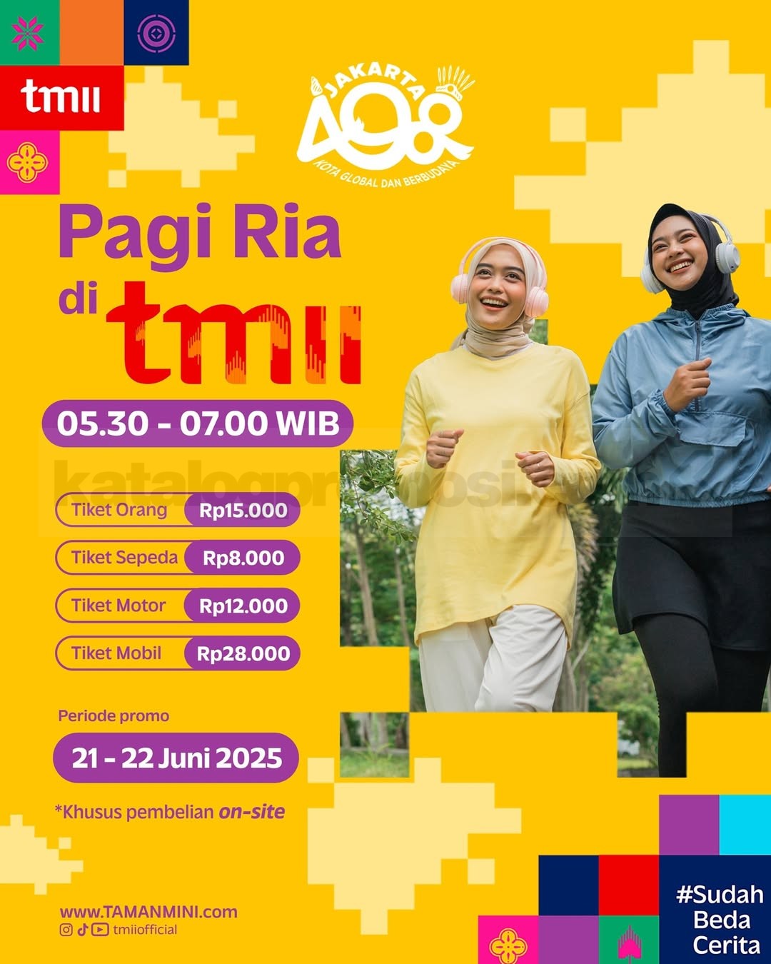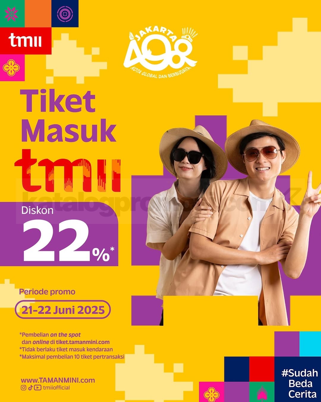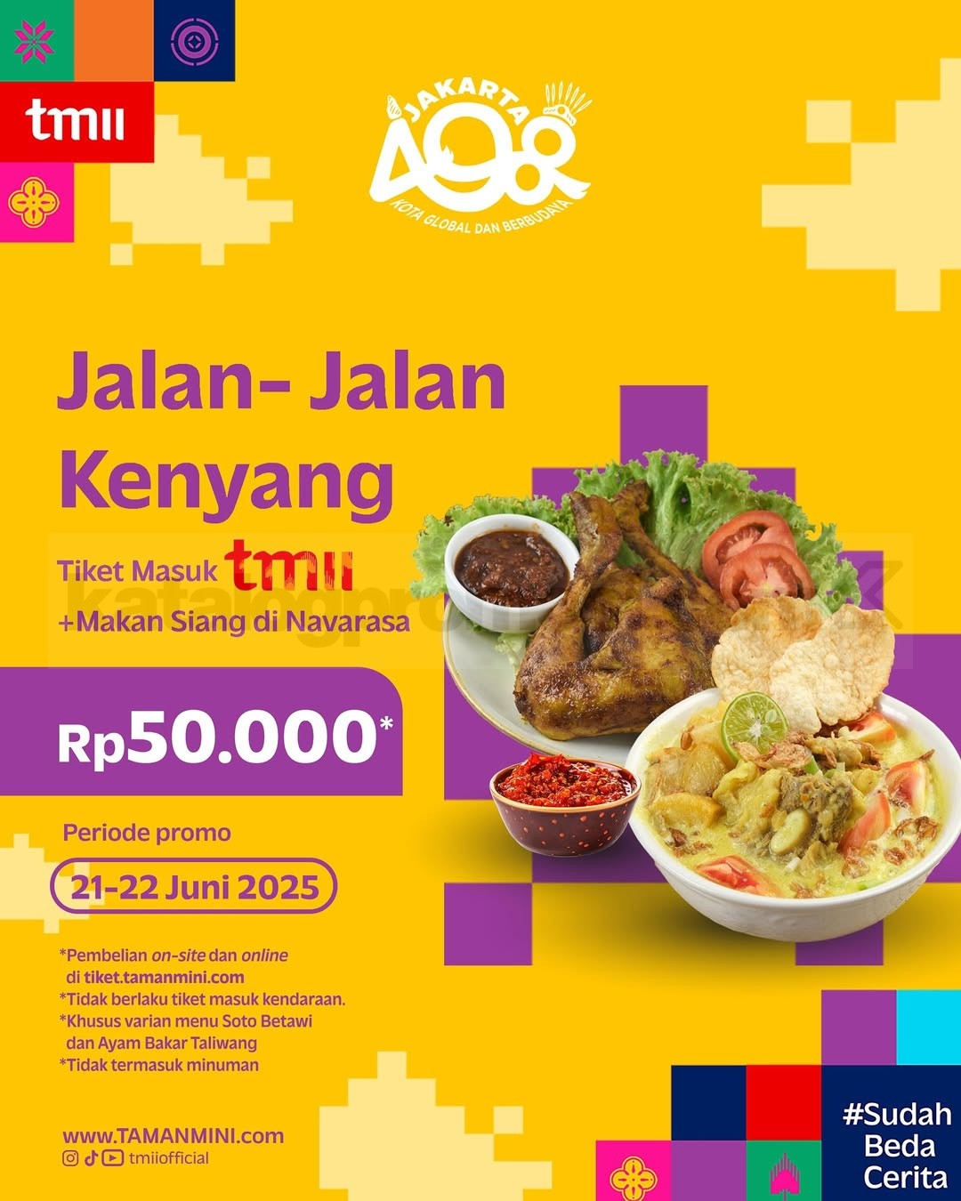 Rayakan ulang tahun Jakarta ke-498 bareng TMII yang #SudahBedaCerita! Selama 21–22 Juni 2025, kamu bisa eksplorasi wahana, beli merchandise, atau sekadar menikmati suasana budaya yang makin modern dengan harga spesial. Ini dia promonya: