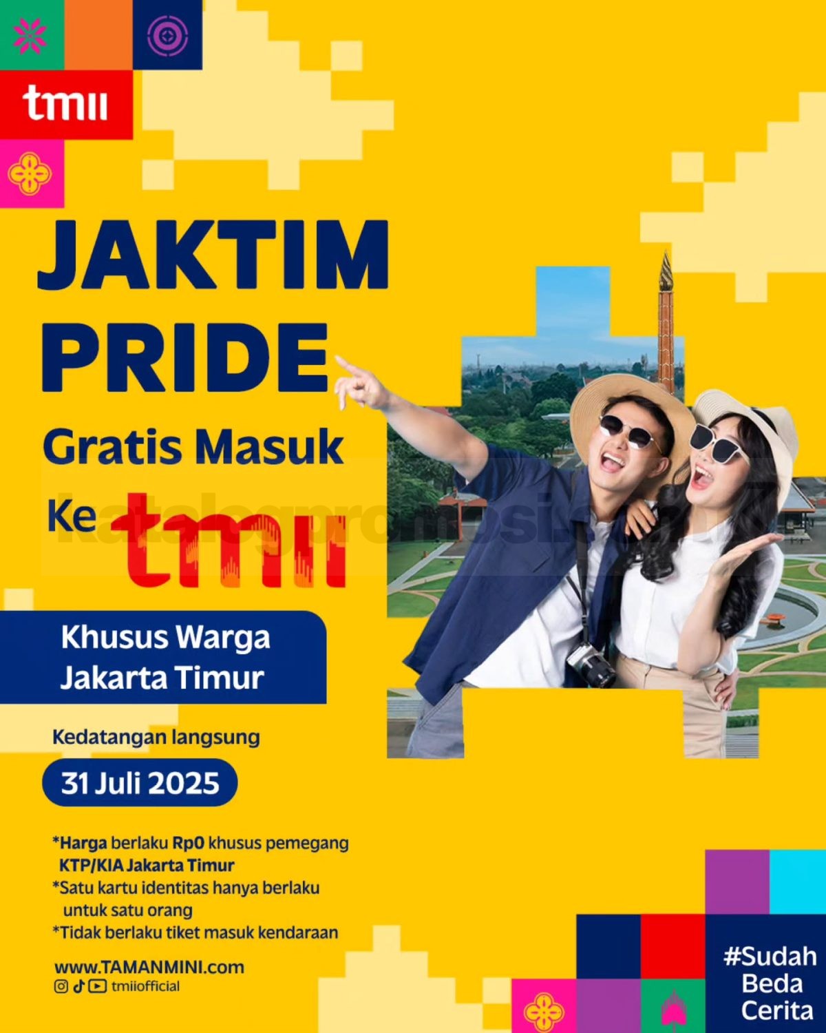 Liburan makin seru dengan hadirnya Promo TMII JAKTIM PRIDE Beli 1 Gratis Tiket Masuk khusus untuk warga Jakarta Timur! Buat kamu yang ingin menikmati wisata edukasi, rekreasi, dan spot ikonik TMII tanpa keluar biaya banyak, promo ini wajib banget kamu manfaatkan. Cukup tunjukkan KTP atau KIA Jakarta Timur saat pembelian tiket on-site, kamu langsung dapat 1 tiket gratis setiap pembelian 1 tiket reguler.