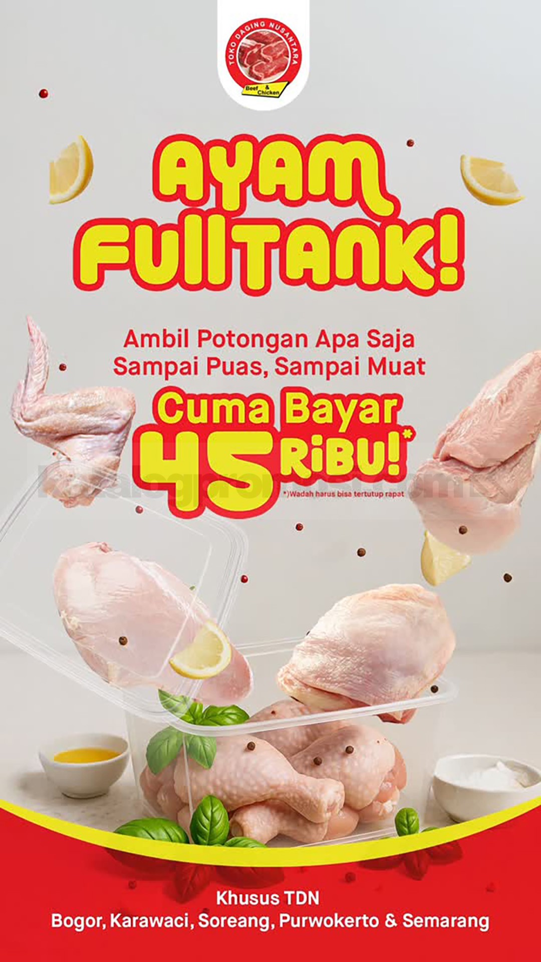 Nikmati serunya isi wadah ayam sepuasnya di TDN. Dengan Rp45.000, kamu bisa bawa pulang ayam full tank buat stok rumah atau masak bareng keluarga.
