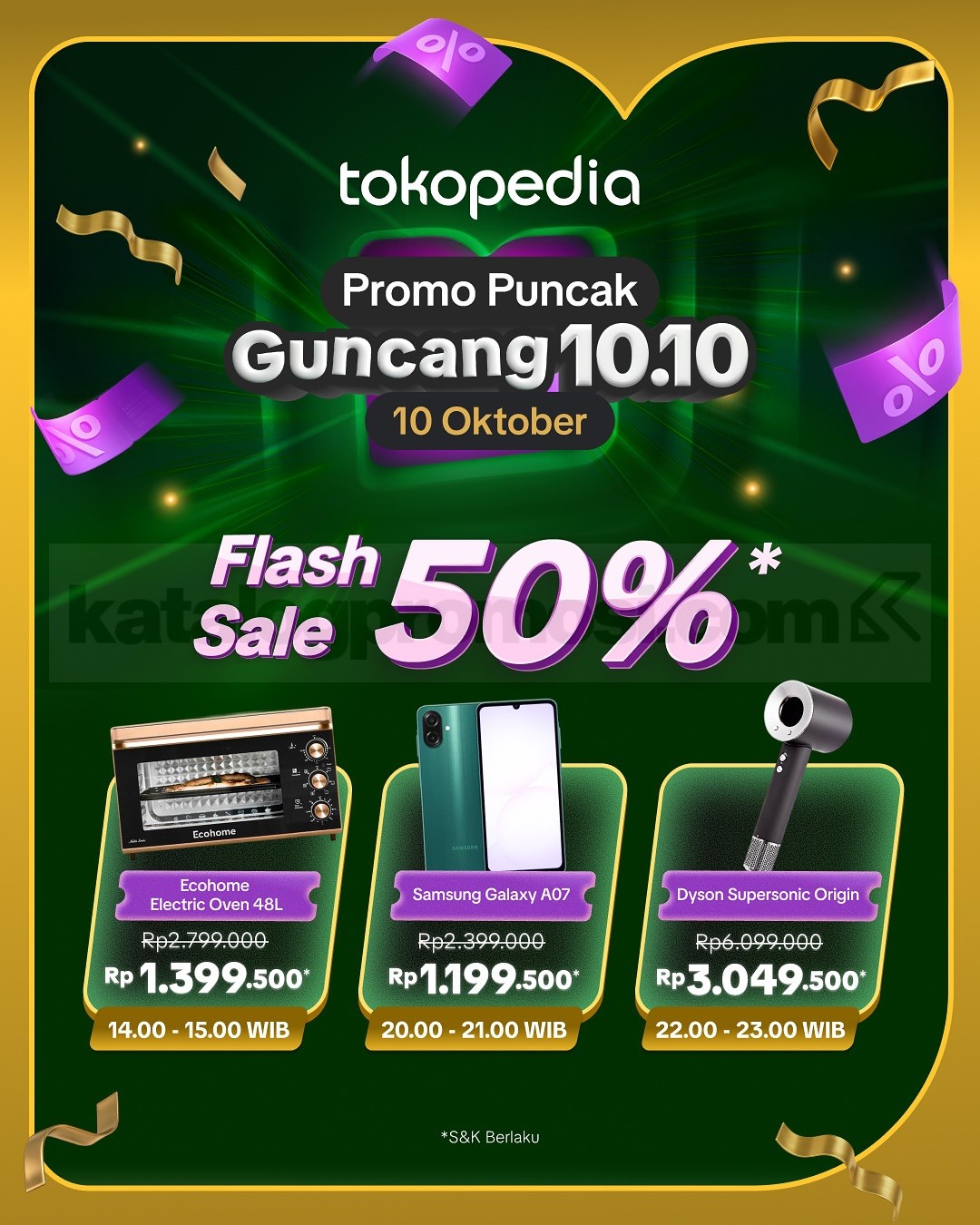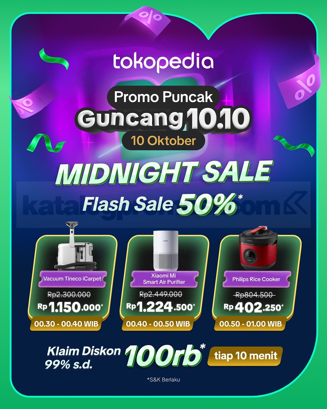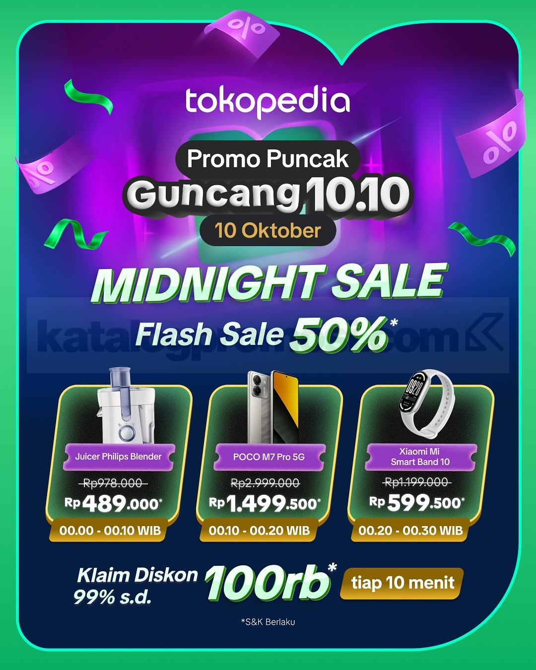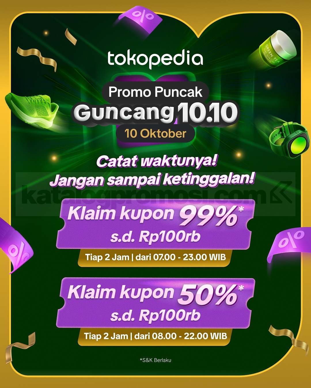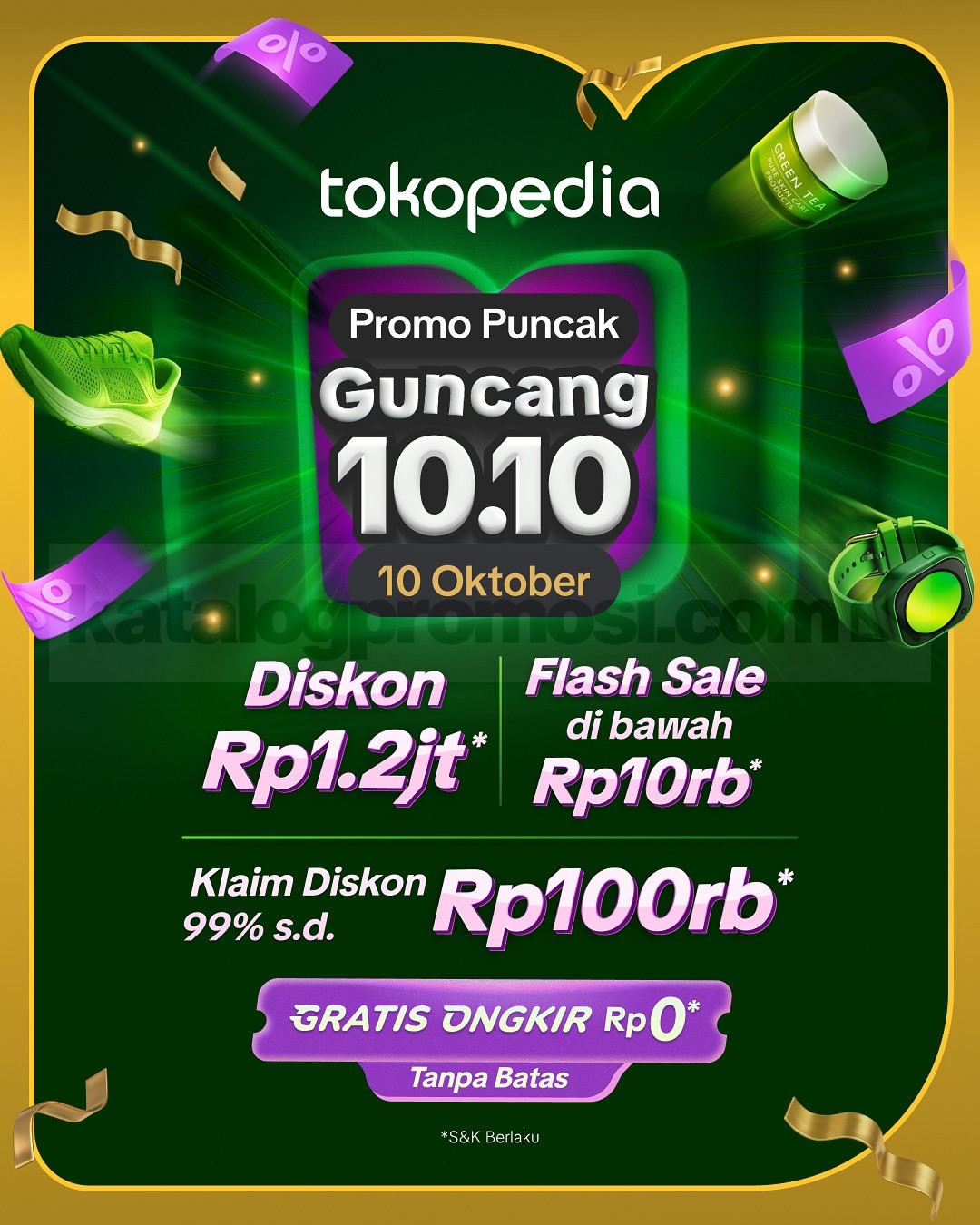 Promo Tokopedia Puncak Guncang 10.10 berlaku 10 Oktober 2025 dengan diskon hingga Rp. 1,2 juta, flash sale di bawah Rp. 10 ribu, dan gratis ongkir tanpa batas.
