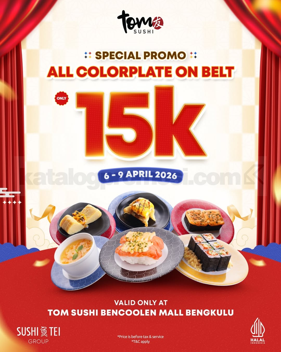 Promo Tom Sushi Bengkulu All Colorplate Rp. 15.000 per piring berlaku 6 April 2026 – 9 April 2026 di Bencoolen Mall Bengkulu