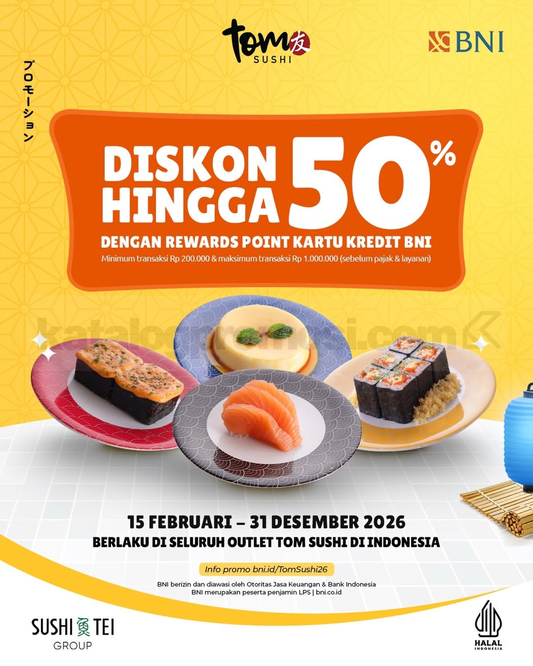Promo Tom Sushi BNI Rewards Diskon 50% dengan minimum transaksi Rp 200.000 berlaku mulai tanggal 15 Februari 2026 – 31 Desember 2026 di seluruh outlet