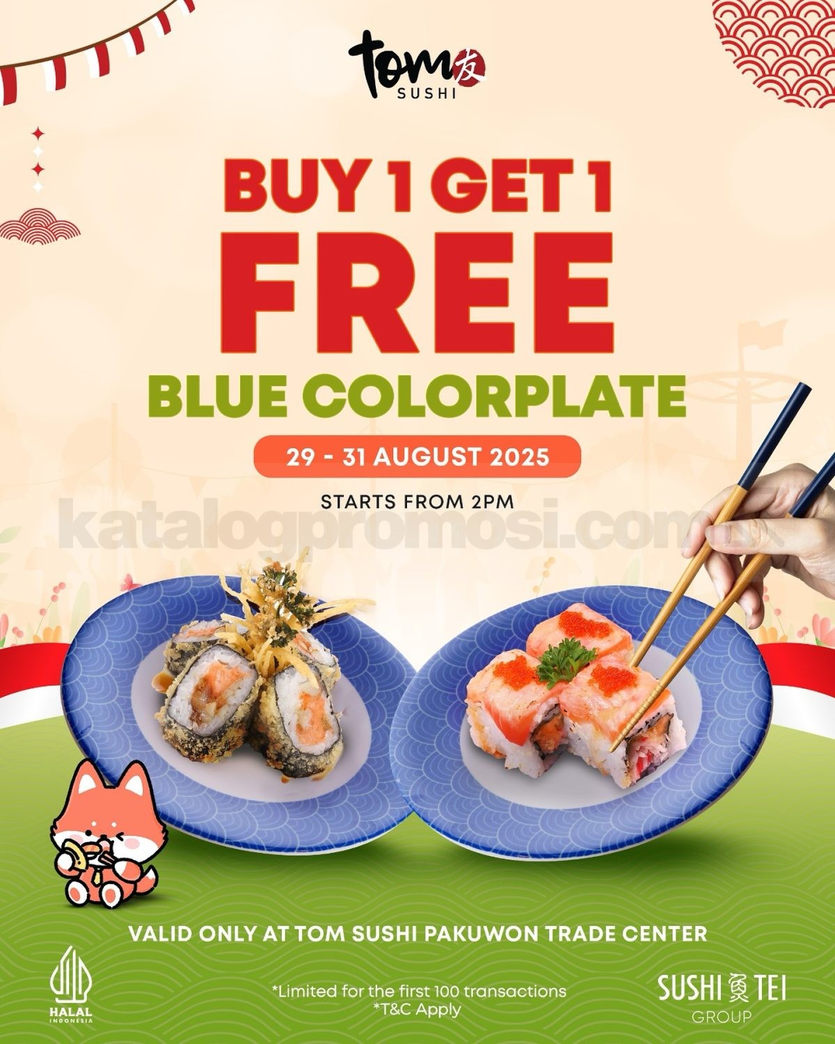 Promo Tom Sushi Buy 1 Get 1 Blue Colorplate hadir mulai tanggal 29–31 Agustus 2025 di Pakuwon Trade Center mulai jam 2 siang.