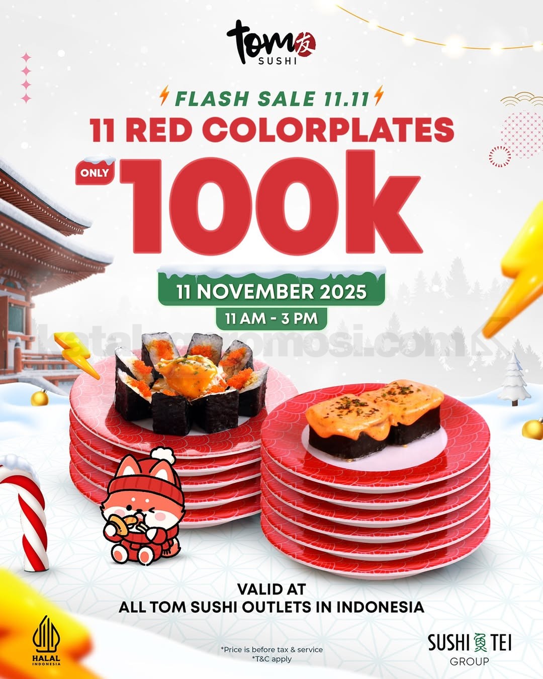 Promo Tom Sushi Flash Sale 11.11 11 Red Colorplates Rp. 100.000, berlaku 11.00–15.00 untuk dine-in di seluruh outlet Tom Sushi Indonesia, hari ini saja.